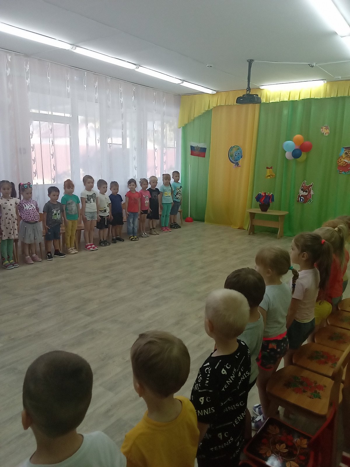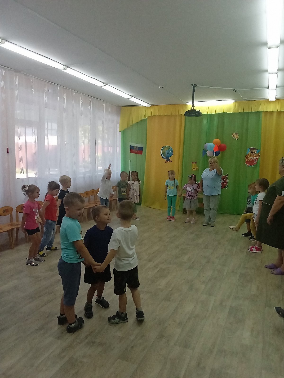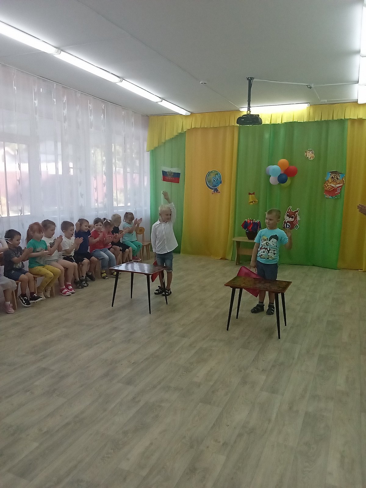 Вот и закончилось яркое, звонкое лето. Наступил сентябрь, а вместе с ним и самый первый праздник в новом учебном году - День знаний, очень светлый и радостный! Традиционно в МБДОУ д/с 15 «Теремок» (п. Новый) состоялось праздничное мероприятие, посвящённое Дню знаний для ребят старшего дошкольного возраста. Начало мероприятия началось с Гимна РФ. Детям напомнили, что флаг РФ поднимается под звуки Гимна. Сегодня мы поиграли с детьми в «школу», а учителями были воспитатели. Звенел звонок, дети занимали места за «партами», начинались «уроки». Дети-«ученики» решали задачки, вспоминали цифры на уроке математики, закрепляли свои знания в играх. Отгадывали загадки, вспоминали пословицы, героев русских народных сказок на «уроке» литературы. Учитель-логопед Екатерина Владимировна провела с детьми логопедические упражнения для развития правильной речи. С большим удовольствием дети занимались на «уроке» физкультуры, показав свою силу, выносливость, смекалку. Между «уроками» были переменки, на которых дети танцевали свои любимые танцы.Поздравляем детей, педагогов, родителей с этим праздником! Этот день открывает новый учебный год. Пусть он будет увлекательным, интересным и принесет новые знания, открытия и новых друзей!