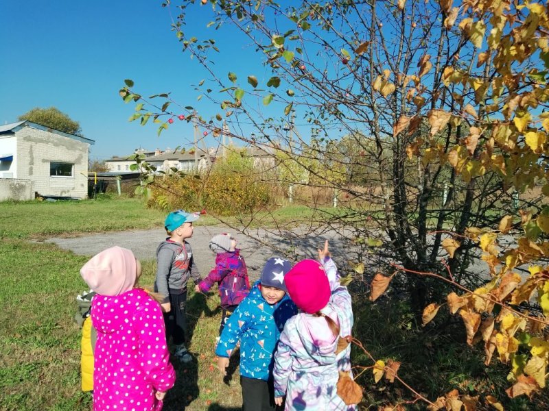 Во время прогулки был организован поход к нашей "дикой " яблоньке. Дети узнали, почему ее так назвали и сделали вывод: выросла яблонька сама из семечка, и поэтому яблочки горько-кислые, а у садовых, сортовых яблонь и груш плоды сочные и сладкие.