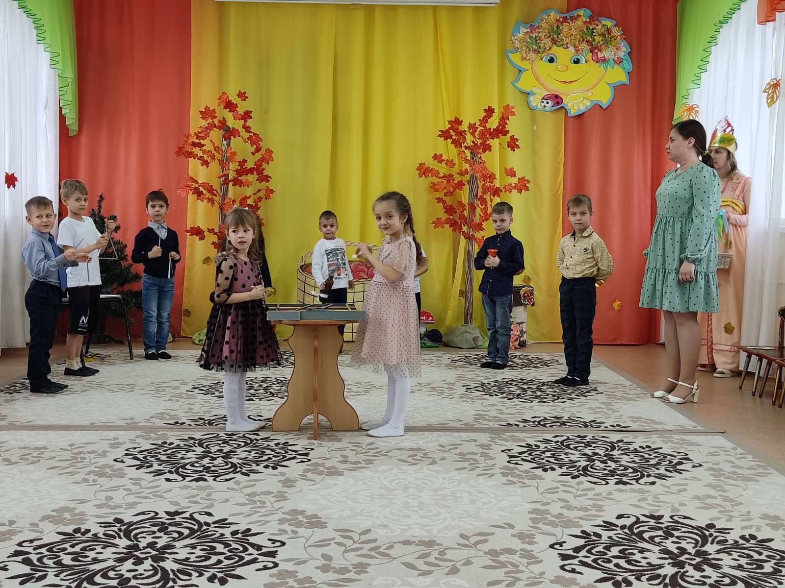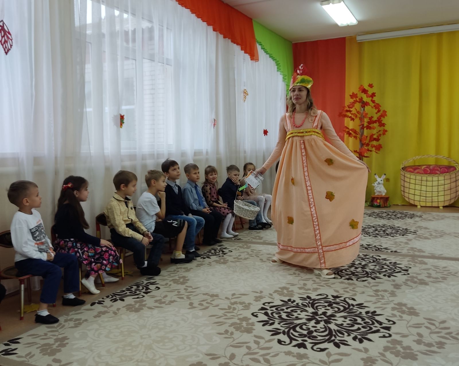 Традиционно, в октябре, в нашем детском саду «Теремок» пос. Первомайский проходят осенние праздники. У детей старшей группы «Ручеек» 31 октября прошел осенний утренник. На дворе пасмурно и холодно, не хватает солнечного тепла, а у нас в музыкальном зале царила теплая, доброжелательная атмосфера.