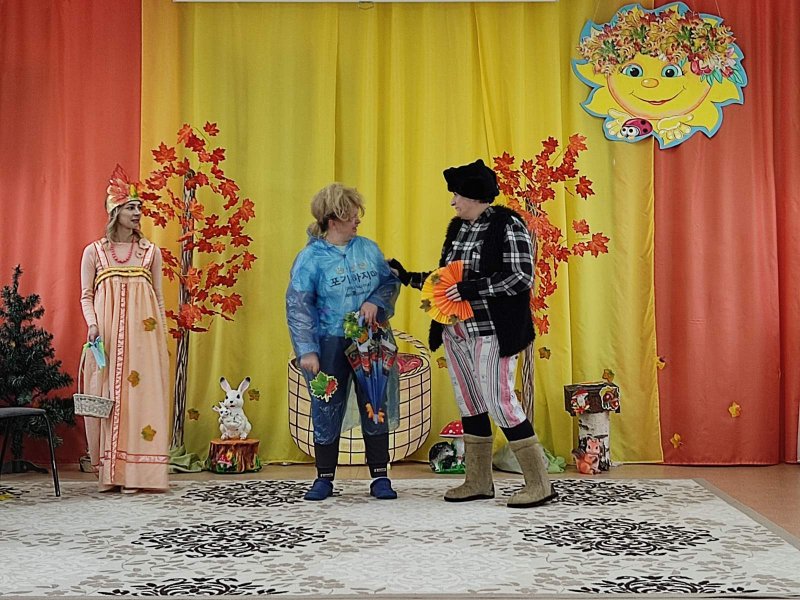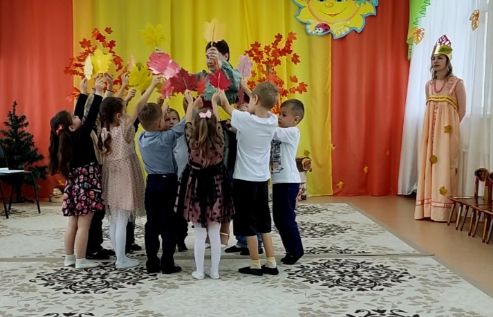 И сама осень-красавица заглянула к нам на праздник. Дети с нетерпением ждали встречи с осенью. Когда Непогода и Слякоть пожаловали на праздник, дети защитили Осень и расколдовали ее от злых чар нежеланных гостей.