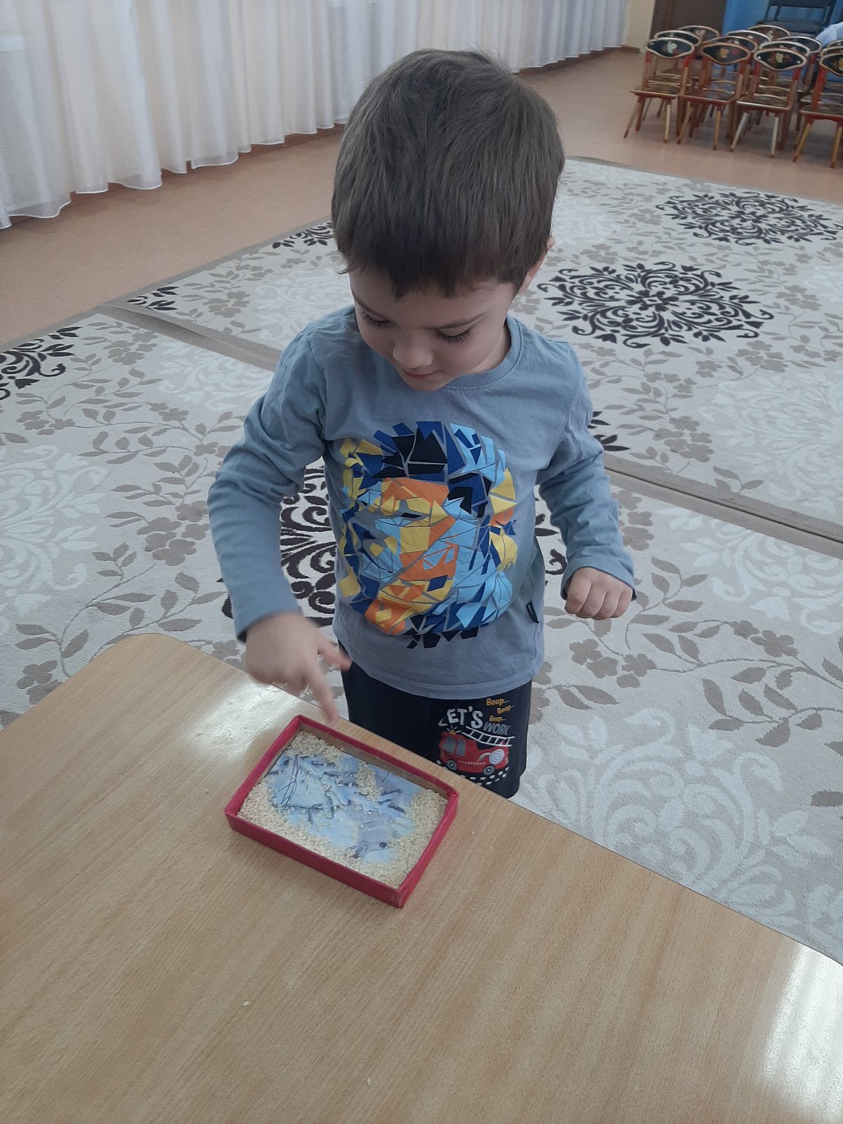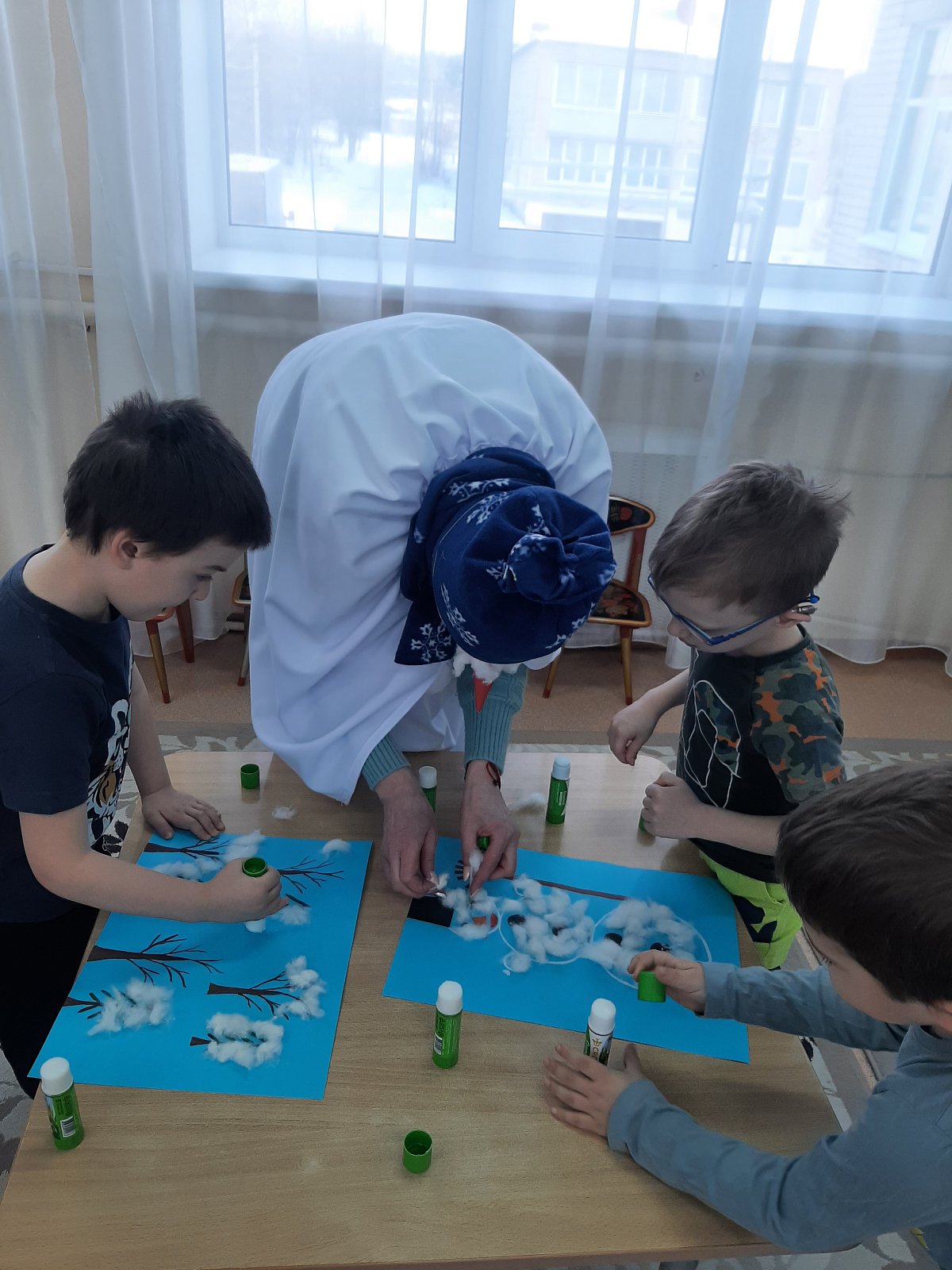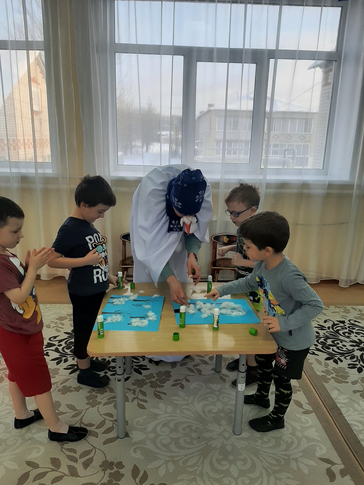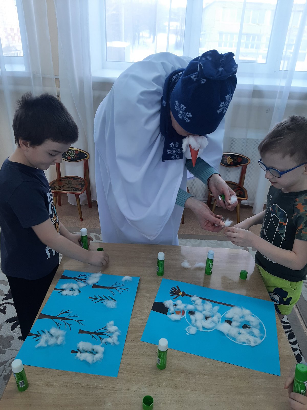 Очень понравились игры на развитие физиологического дыхания, фонематического восприятия, диалогической речи, тонкой и общей моторики, зрительного внимания, которым научил Снеговик-Шутник малышей. Ребята с большим удовольствием раздували сугробы (рис), чтобы узнать любимых друзей Снеговика, а потом парили снежинками, когда налетала вьюга и собирались в сугроб, когда она на время стихала. Сдували пушистые снежинки с кончика носа и ладошек, разучили логоритмическое упражнение «Зайки». А в заключение ребята вместе с воспитателем Т.А. Казанцевой помогли вернуть снежинки на картину зимнего леса и портрет Снеговика-Шутника. Занятие получилось очень познавательное и интересное. Волшебное время года только началось, а значит, ребят впереди ждёт ещё много таких же необычных занятий.