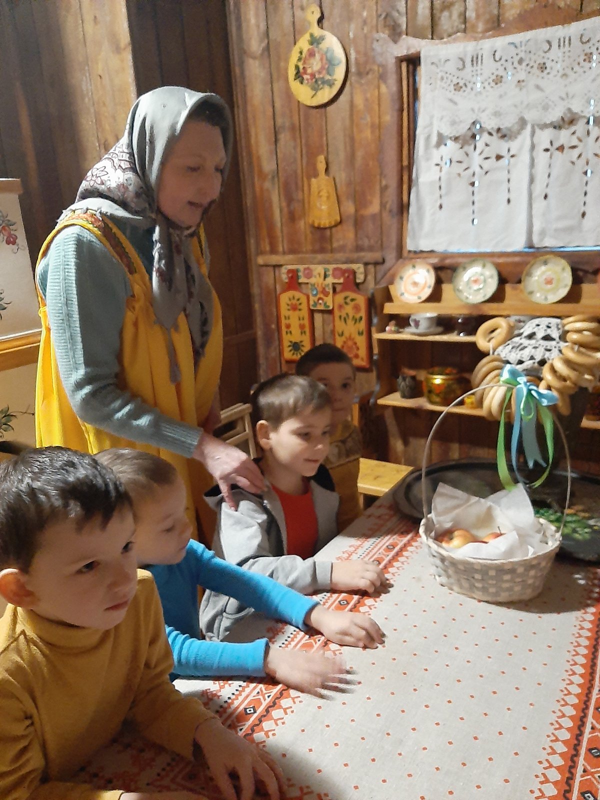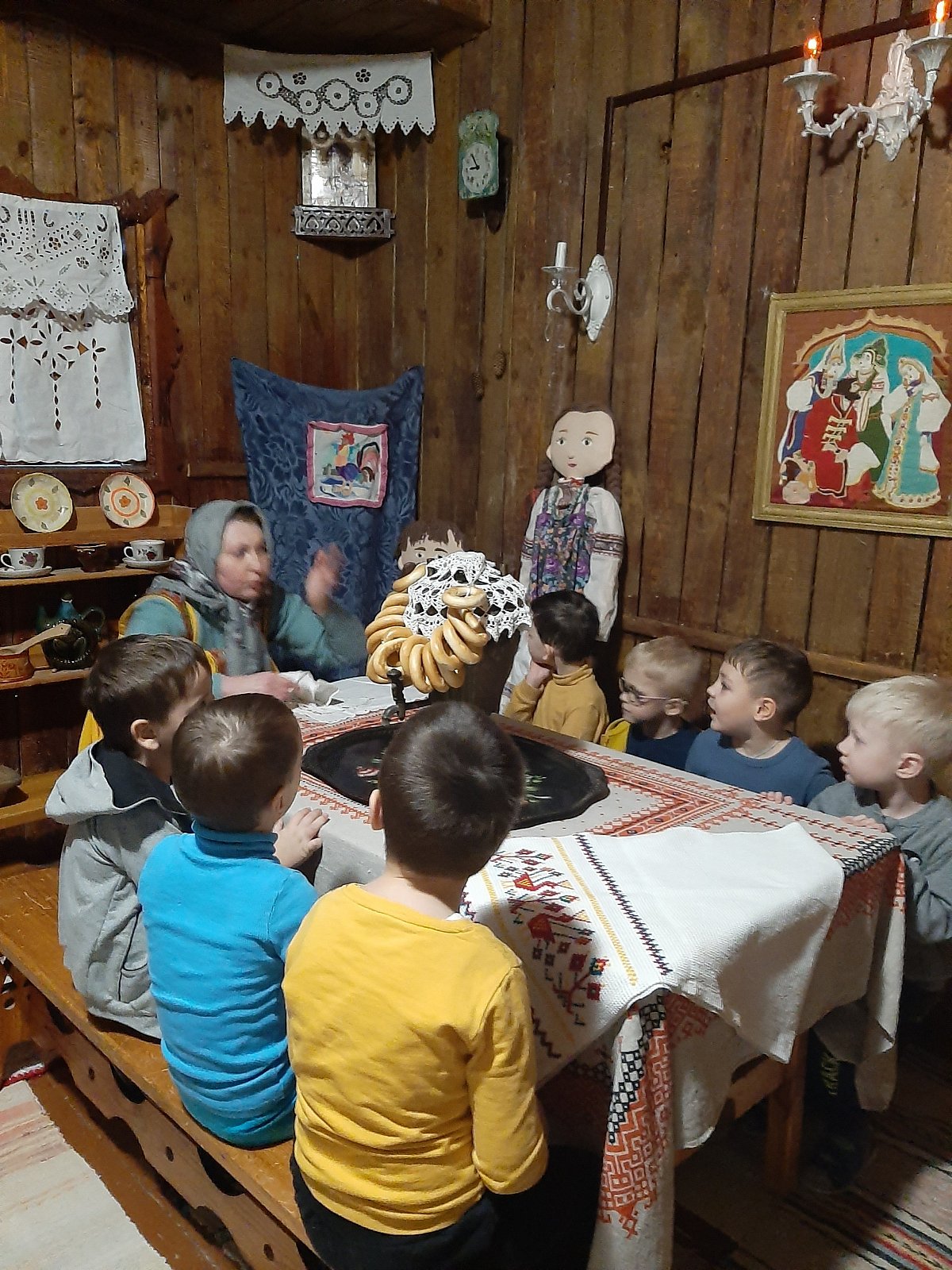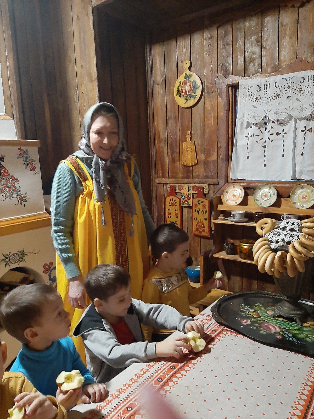 Хозяюшка познакомила детей с интерьером русской избы. Ребята рассмотрели детскую люльку, лапти, коромысло, самовар, печь. Узнали, что в чугуне можно сварить щи и кашу. В знак благодарности за помощь Хозяюшка угостила всех вкусными яблоками. Воспитанники с большим интересом общались с Хозяюшкой и решили, что ещё не один раз придут в гости в русскую избу.