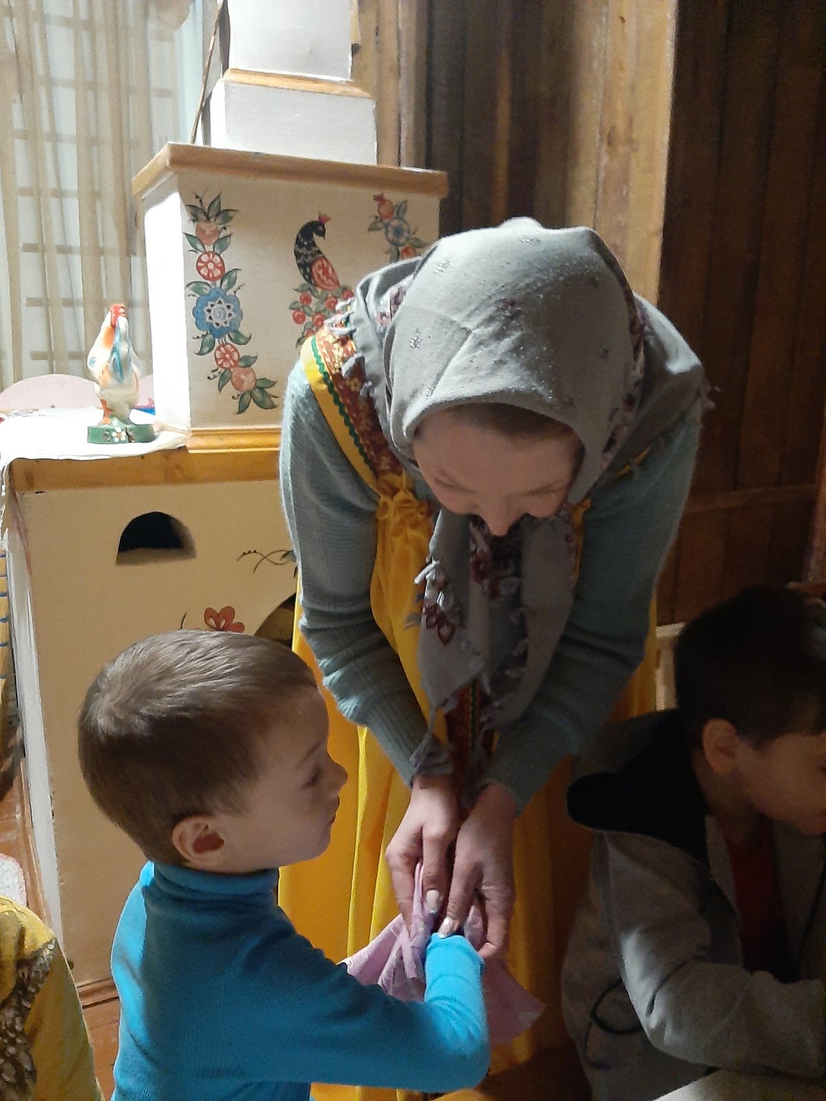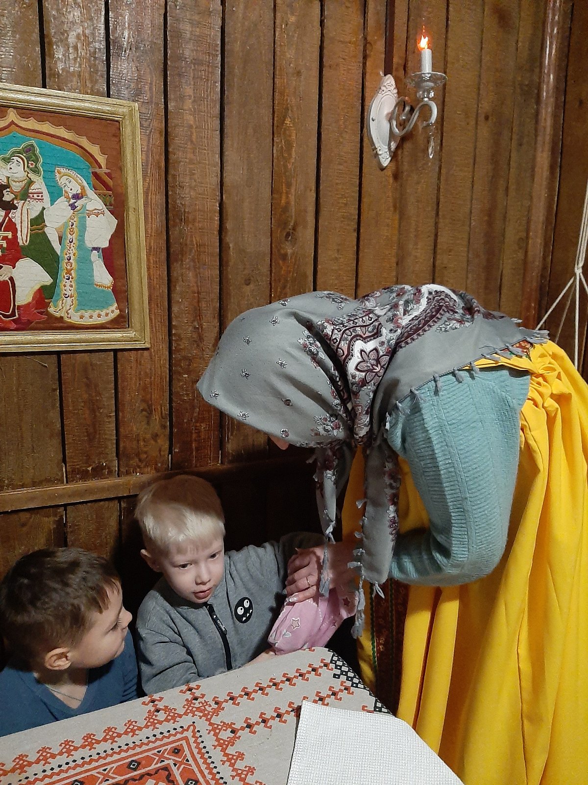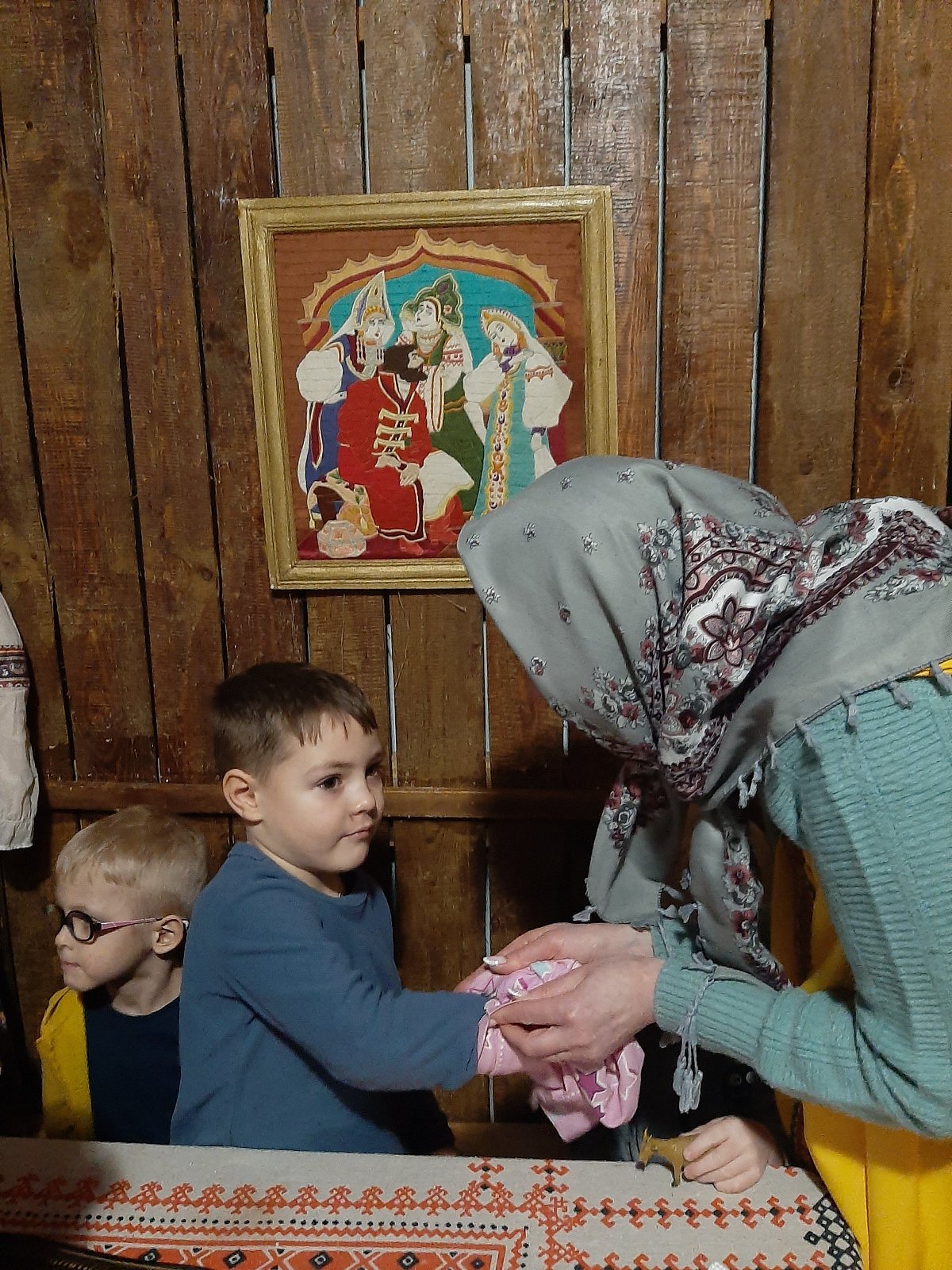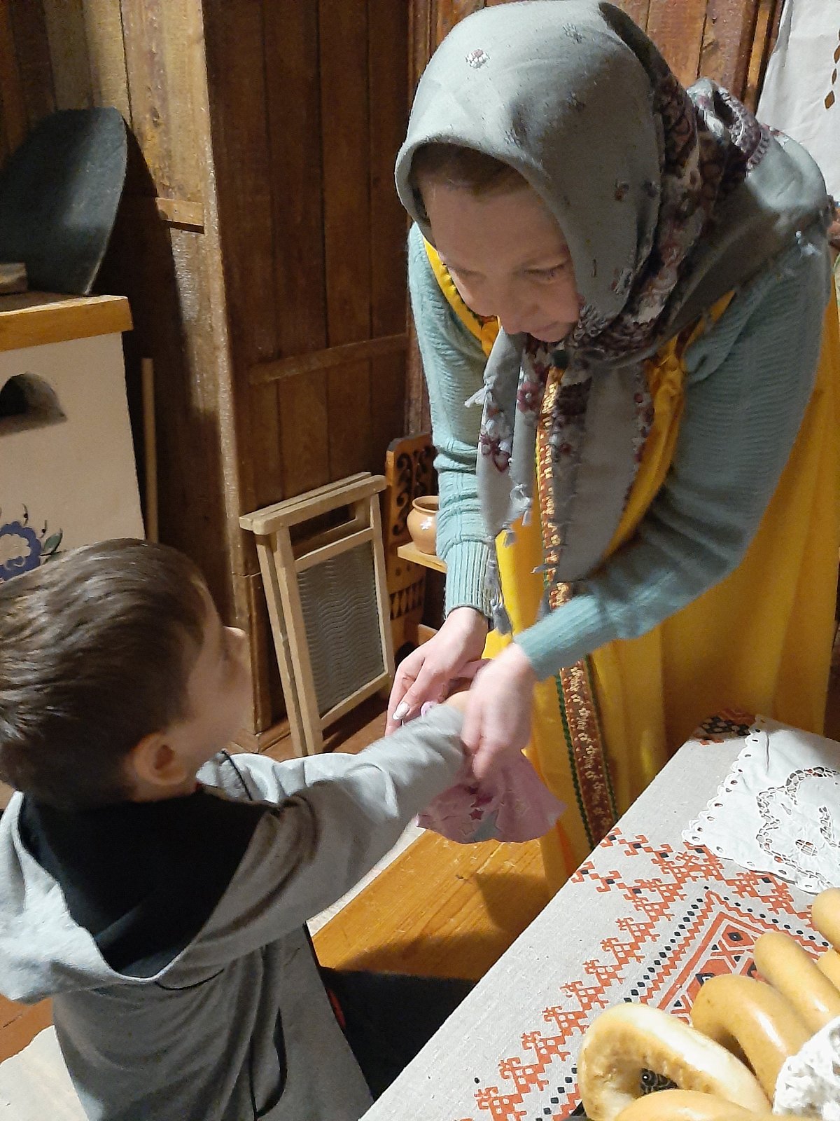 Хозяюшка познакомила детей с интерьером русской избы. Ребята рассмотрели детскую люльку, лапти, коромысло, самовар, печь. Узнали, что в чугуне можно сварить щи и кашу. В знак благодарности за помощь Хозяюшка угостила всех вкусными яблоками. Воспитанники с большим интересом общались с Хозяюшкой и решили, что ещё не один раз придут в гости в русскую избу.