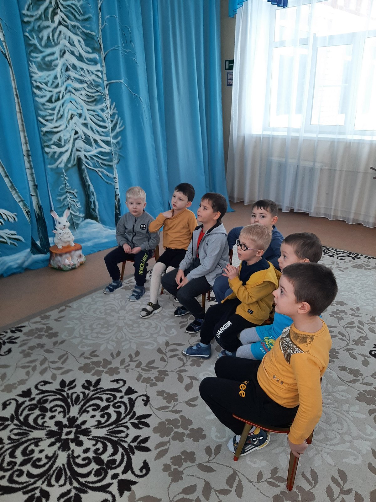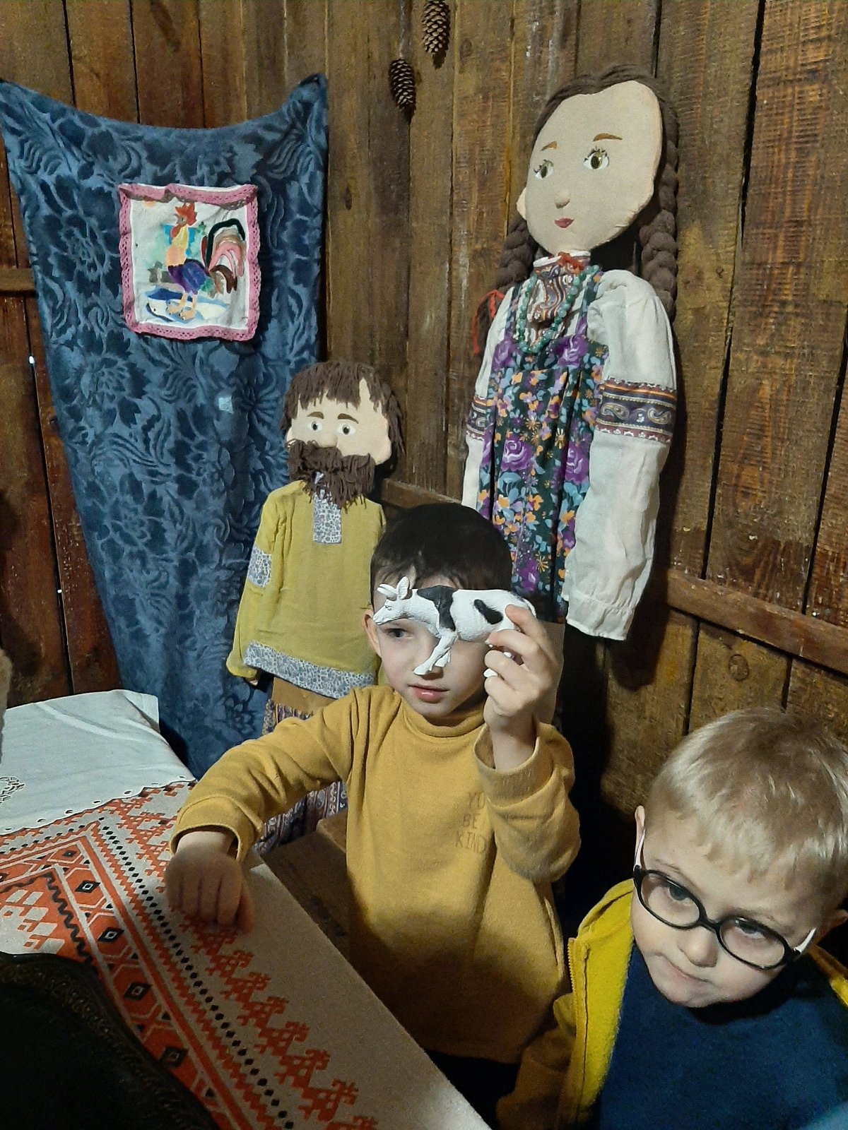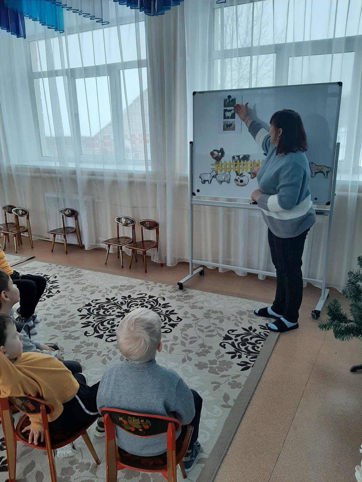 Ребята узнали, какие животные жили у Хозяюшки (игра «Чудесный мешочек») и отправились в зимний лес их искать. Им предстояло определить по голосам, кто идет к ним навстречу (игра «Угадай, кто кричит»). Эти игры решали такие задачи, как развитие связной речи, фонематического восприятия, логического мышления, зрительного и слухового внимания, развитие тонкой моторики и тактильных ощущений. После того, как все животные были найдены, Хозяюшка поиграла с ребятами в весёлую логоритмическую игру «Телёнок», направленную на словообразование и координацию речи с движением (хвостатый, рогатый, ушастый, глазастый…)