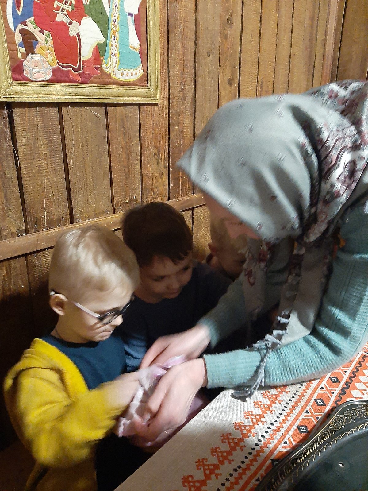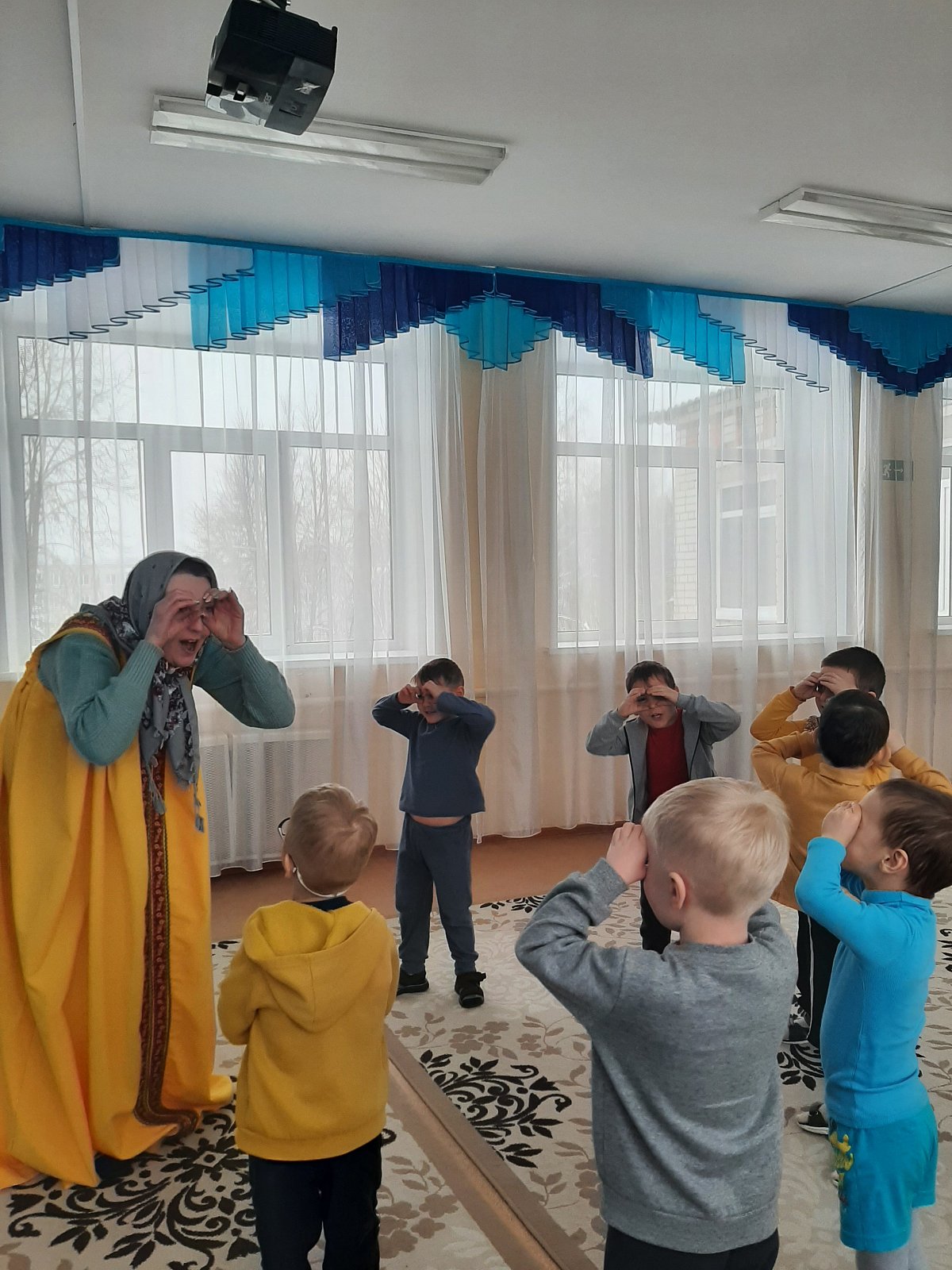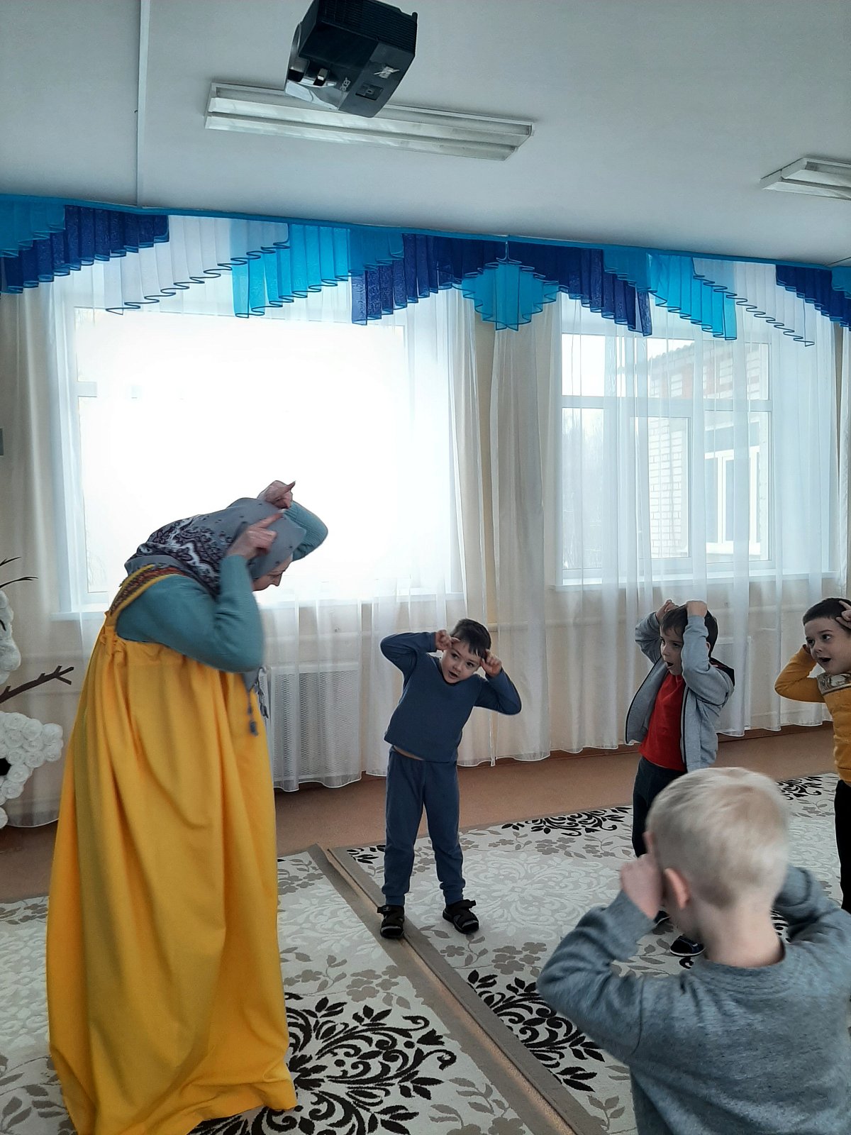 Ребята узнали, какие животные жили у Хозяюшки (игра «Чудесный мешочек») и отправились в зимний лес их искать. Им предстояло определить по голосам, кто идет к ним навстречу (игра «Угадай, кто кричит»). Эти игры решали такие задачи, как развитие связной речи, фонематического восприятия, логического мышления, зрительного и слухового внимания, развитие тонкой моторики и тактильных ощущений. После того, как все животные были найдены, Хозяюшка поиграла с ребятами в весёлую логоритмическую игру «Телёнок», направленную на словообразование и координацию речи с движением (хвостатый, рогатый, ушастый, глазастый…)