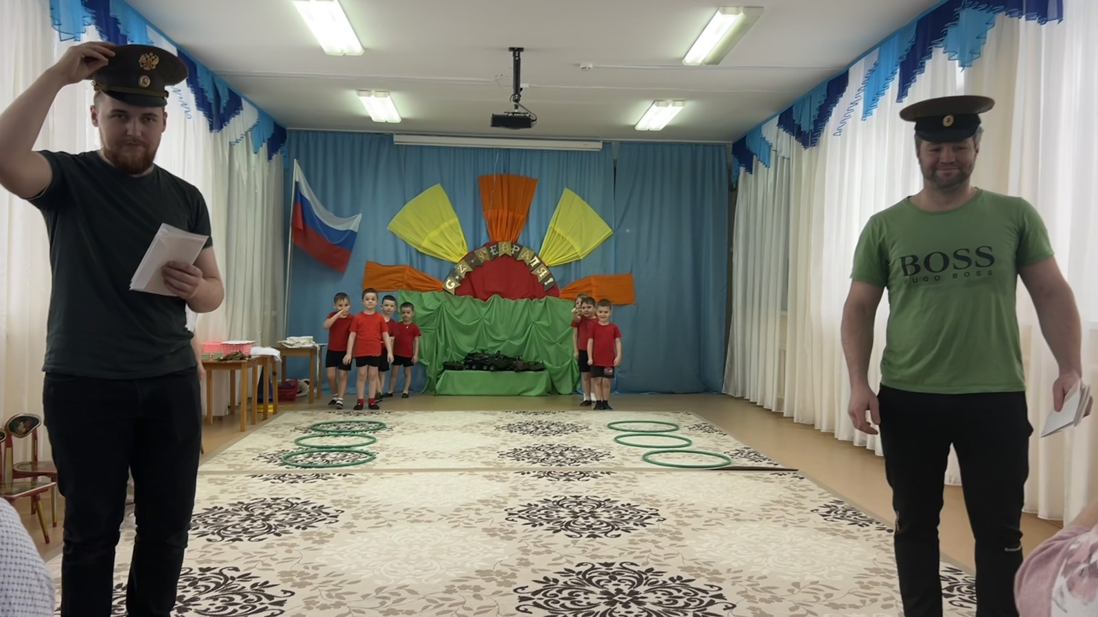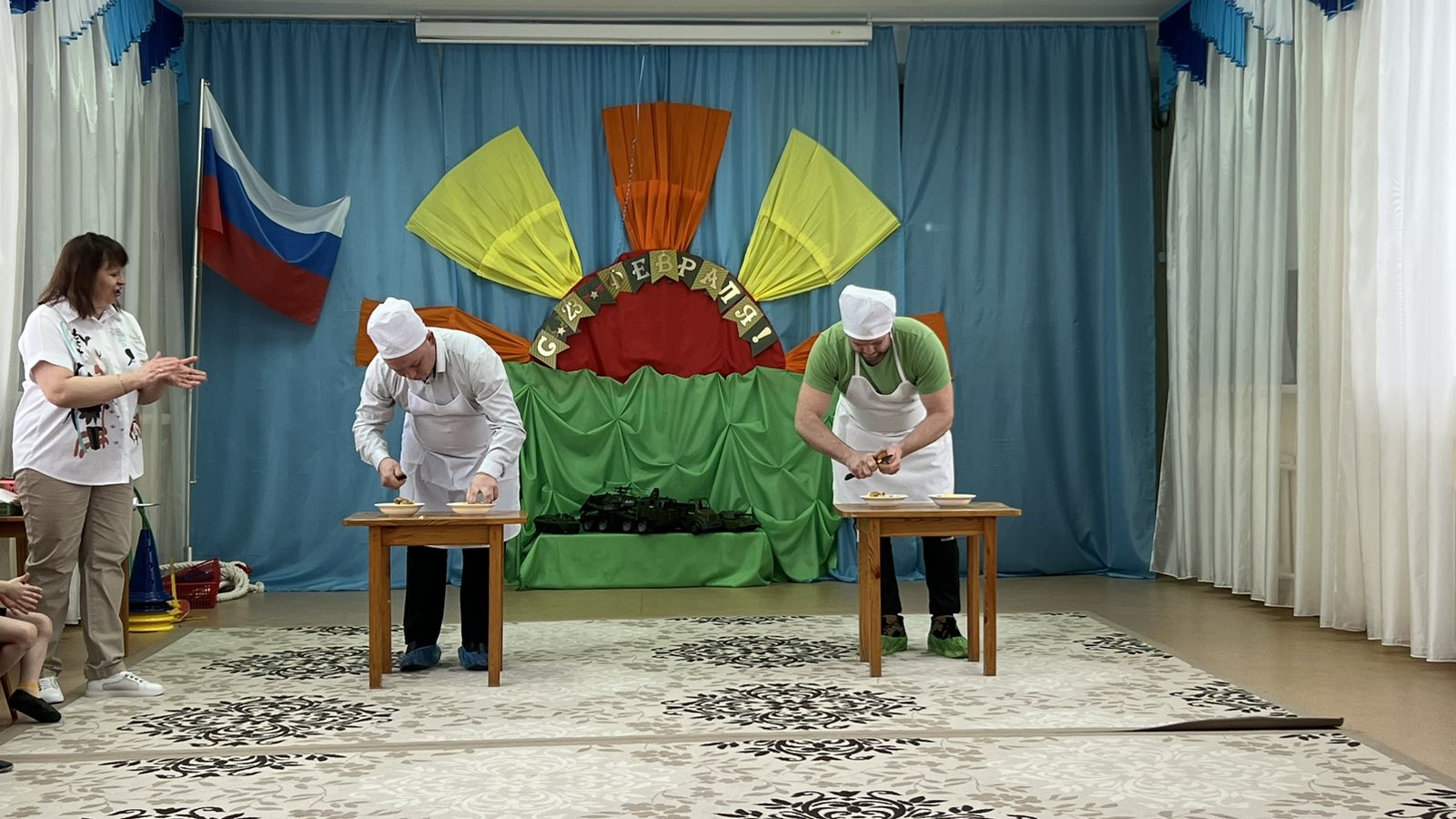 Главными гостями на нашем празднике стали папы и дедушки. Они вместе с детьми участвовали в конкурсах: «Меткие стрелки», «Быстрая кавалерия», «Отдай честь командиру», «Да или нет», «Кто быстрее почистит картошку», «Сапёры», «Разведчики», «Перетягивание каната», где показали свои умения, силу, ловкость, взаимовыручку и взаимопомощь.