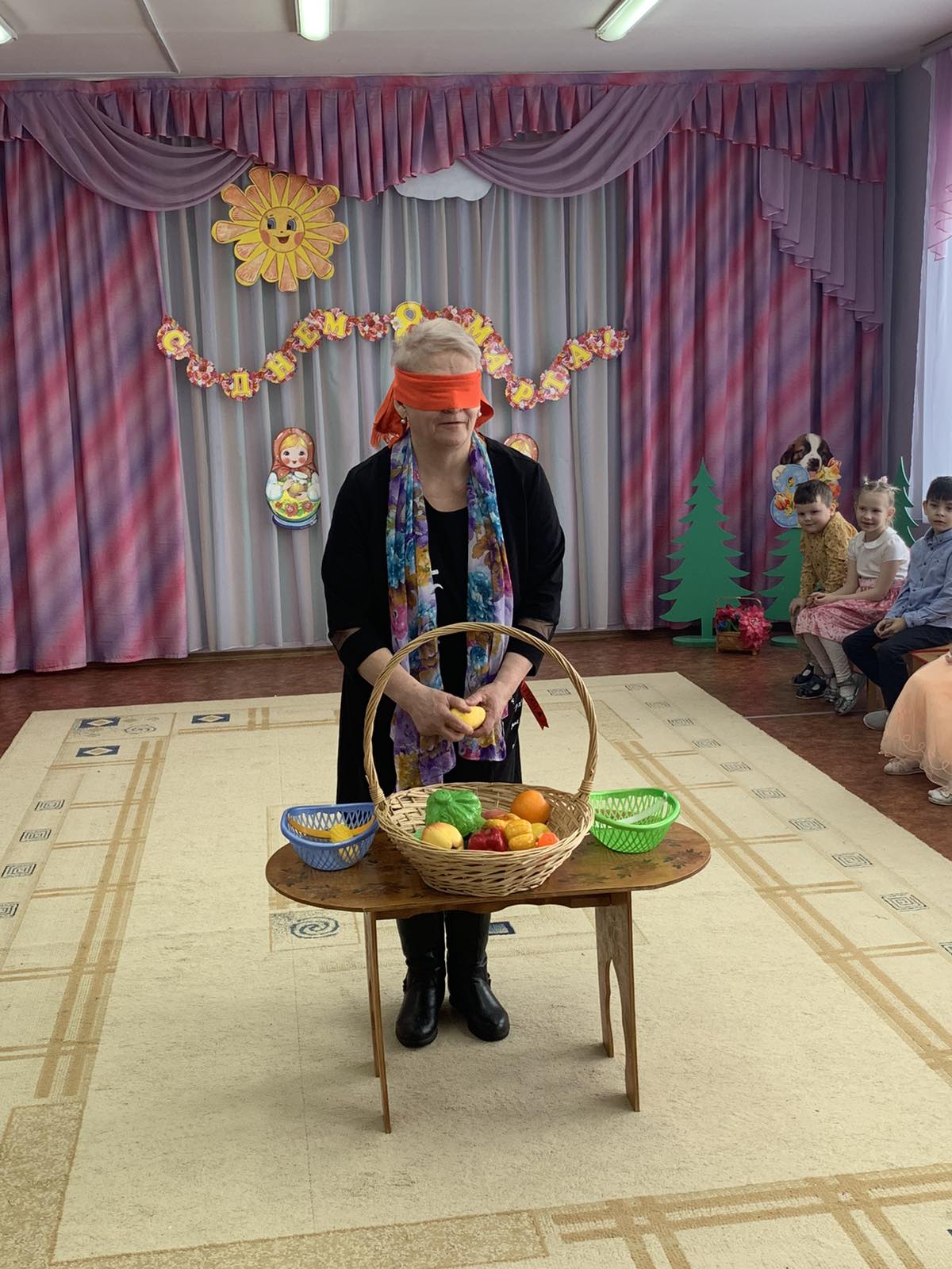А у Сони Симоновой бабушка Алла Ивановна проявила свой талант в конкурсе "Разберем овощи и фрукты по корзинкам с закрытыми глазами". Бабушка легко справилась с заданием и рассказала, какие блюда можно приготовить из овощей и фруктов к празднику.