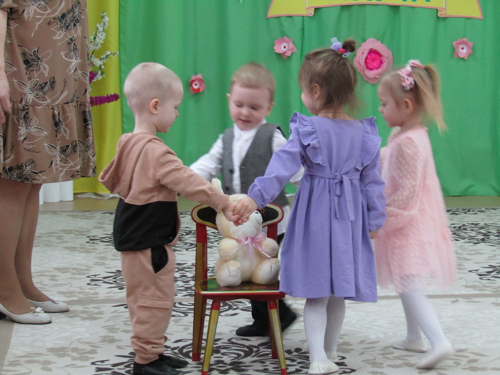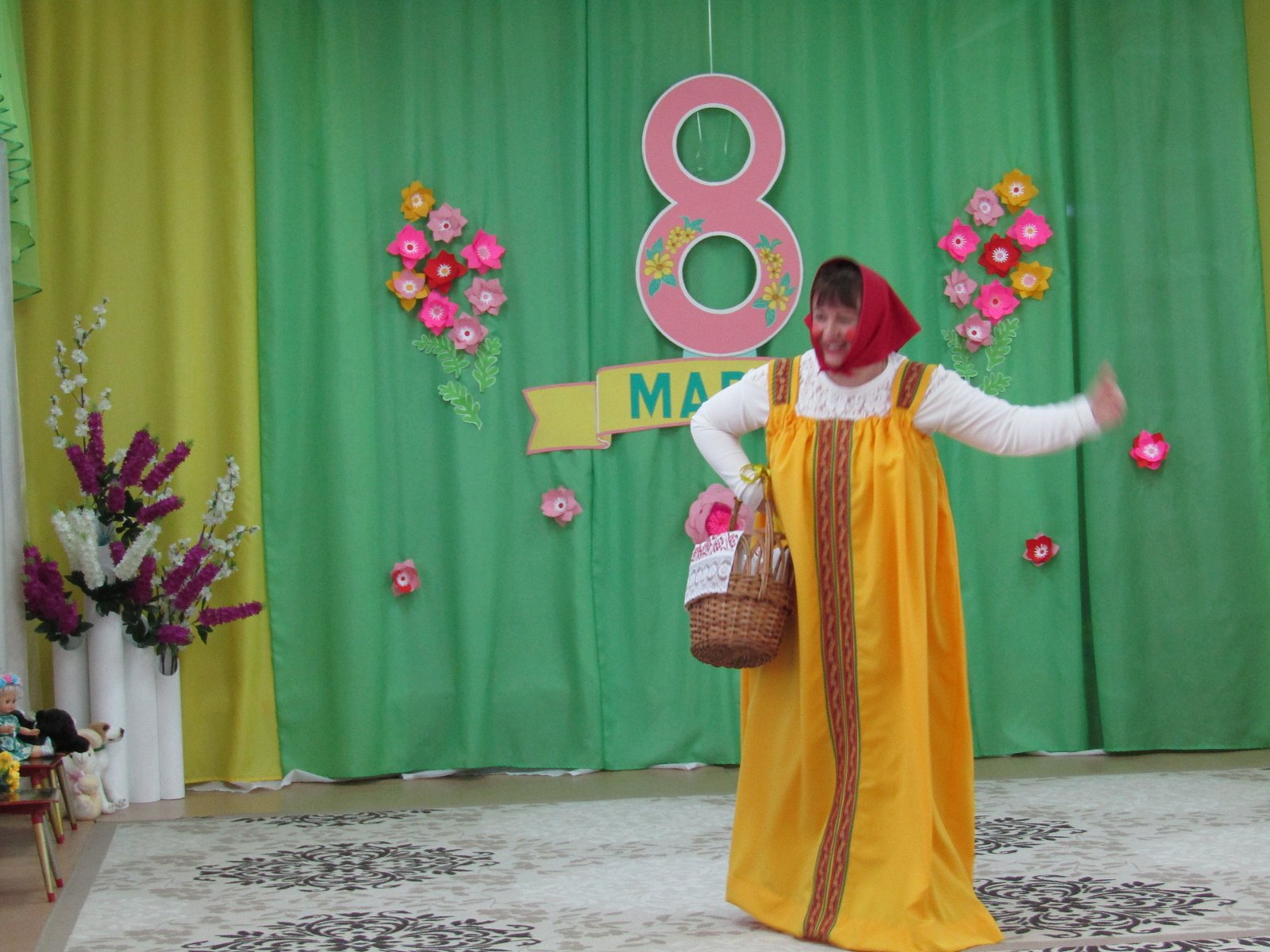 5 марта в нашем детском саду «Теремок» пос. Первомайский в группе «Елочка» состоялся утренник, посвященный такому прекрасному празднику. На утреннике наши дети рассказывали праздничные стихотворения, пели красивые песенки, танцевали и играли в оркестре. В гости к детям приходила Матрешка, с которой они весело играли. В конце праздника дети поздравили мам танцем с цветами, который завершился словами «ПОЗДРАВЛЯЕМ».