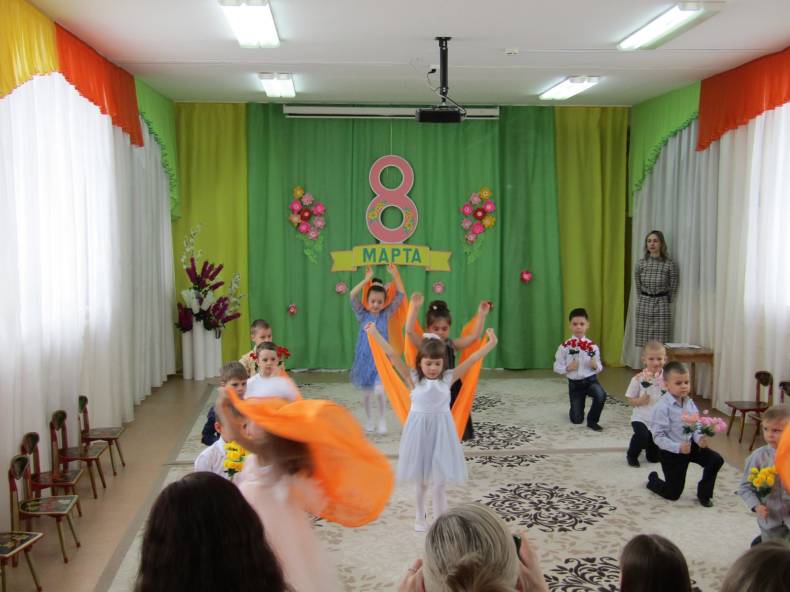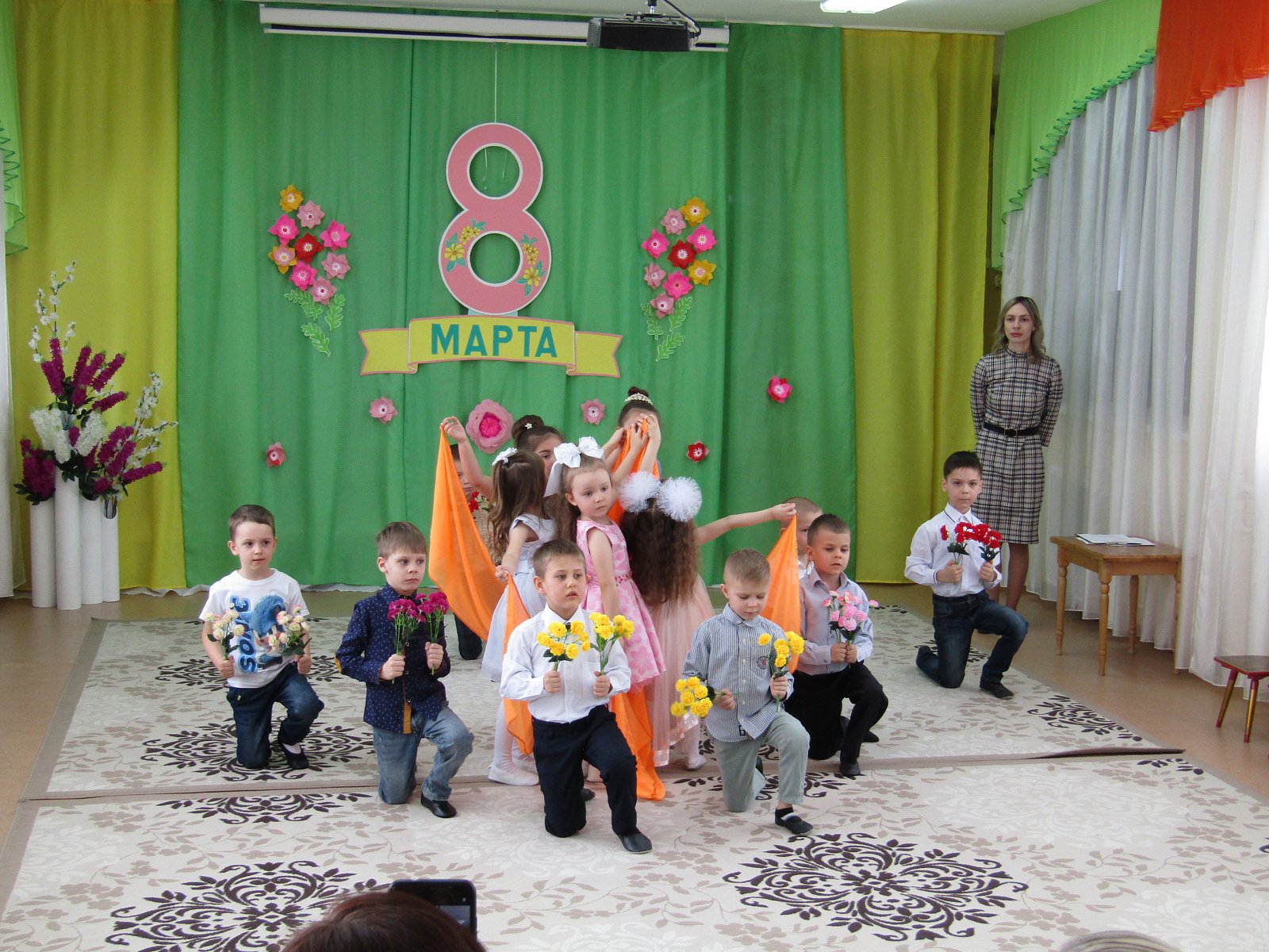 7 марта в детском саду «Теремок» пос. Первомайский в группе «Ручеек» прошел утренник ко дню 8 марта. Прозвучали трогательные песни, стихи о мамах и бабушках. Дети подарили нежные, красивые танцы. А также участвовали в веселых играх и шутках минутках. В заключении праздника дети подарили цветы, сделанные своими руками.