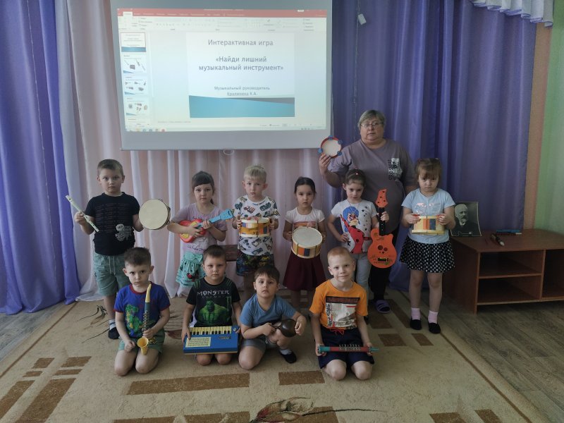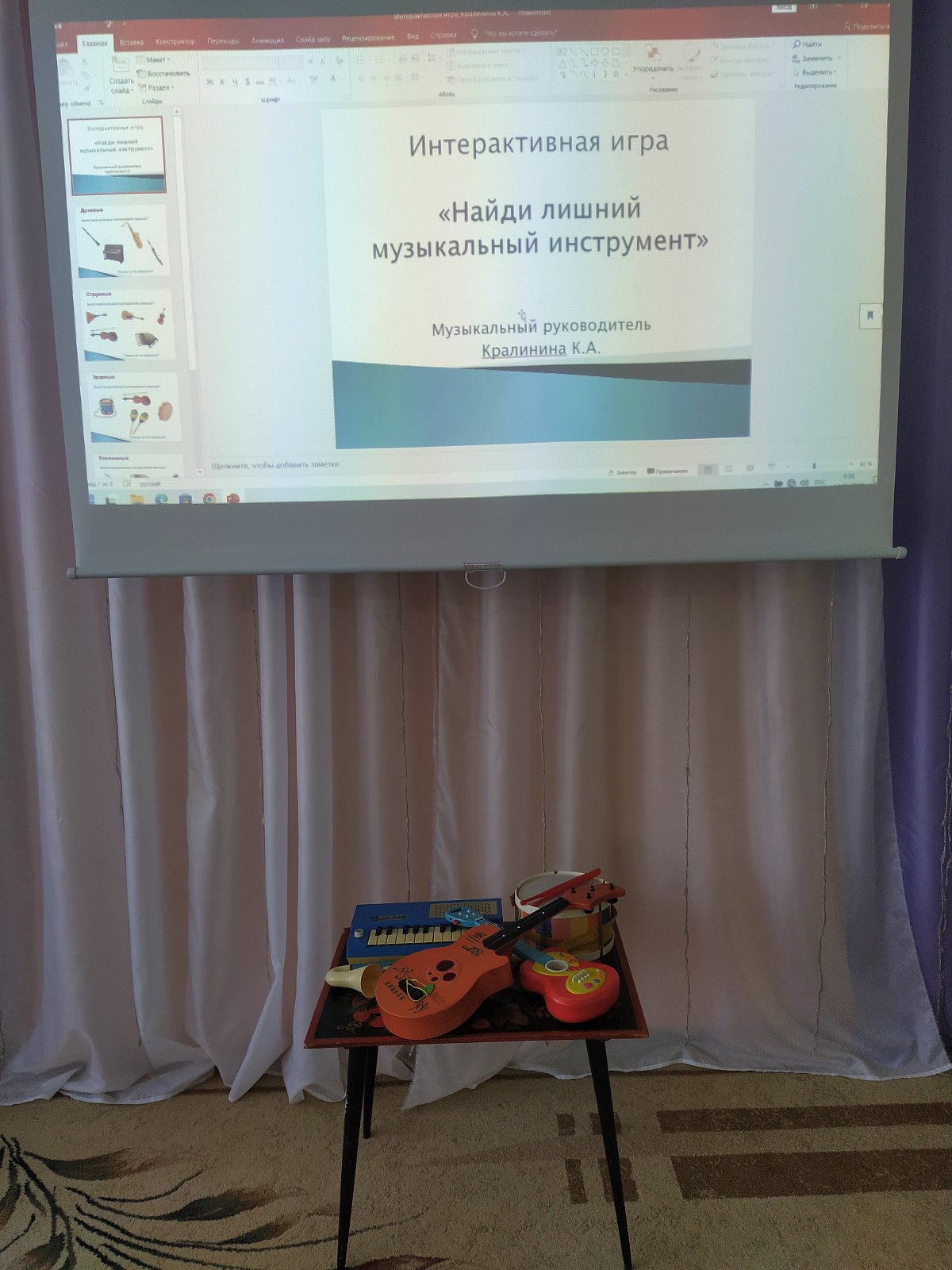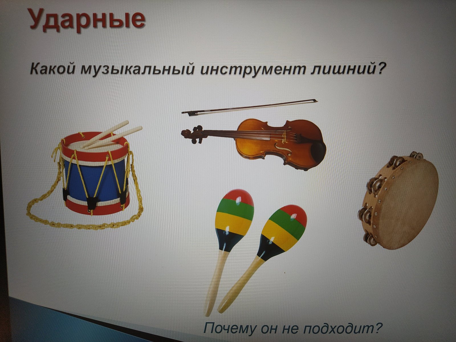 13.03. в группе «Колокольчик» - воспитатель Болдыш Е.А. была показана презентация авторской игры Кралининой К.А. «Найди лишний инструмент». Дети хорошо знают классификацию групп музыкальных инструментов (духовые, струнные, клавишные, ударные). Поэтому, легко справились с заданием игры. Отвечали на вопросы правильно, быстро и уверенно, что очень порадовало нас, педагогов. В конце игры ребята взяли разные инструменты и сфотографировались с ними.