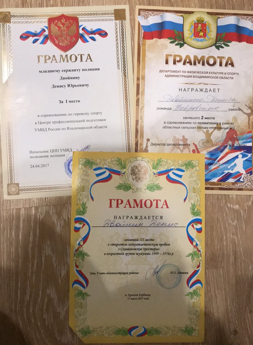 Двойнин Денис Юрьевич работает в МВД России Ковровской ППС. Но несмотря на большую загруженность на работе, Денис Юрьевич находит время для занятий спортом.