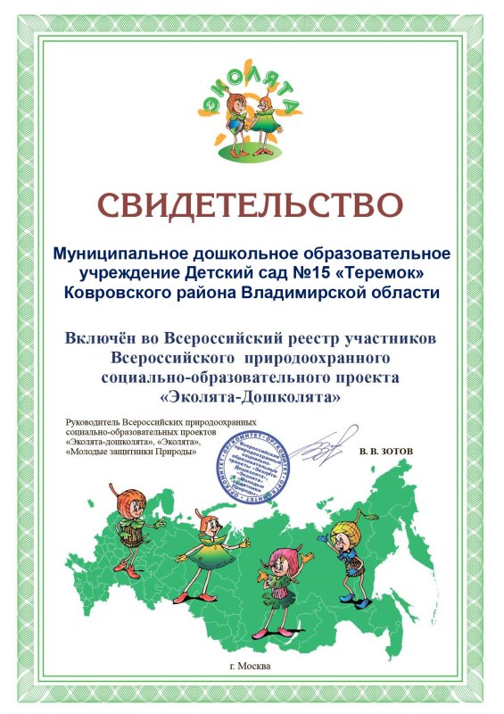В рамках недели экологии МБДОУ детский сад № 15 «Теремок» Ковровского района был включён во Всероссийский реестр участников Всероссийского природоохранного социально-образовательного проекта «Эколята-дошколята». Целью этой недели было экологического просвещения воспитанников, формирования у них ответственного экологического поведения.