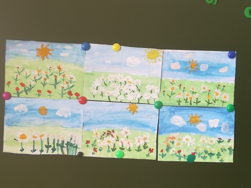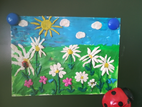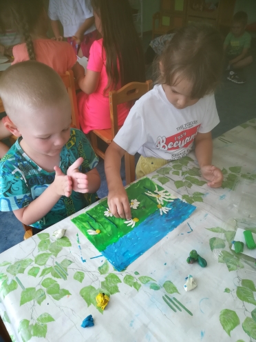 Свои впечатления от наблюдений за цветами на прогулке дети выразили через художественно-продуктивную деятельность. Каждый нарисовал свое" Ромашковое поле". Очень понравилось ребятам "рисовать" картину и пластелина - "Цветущий луг".