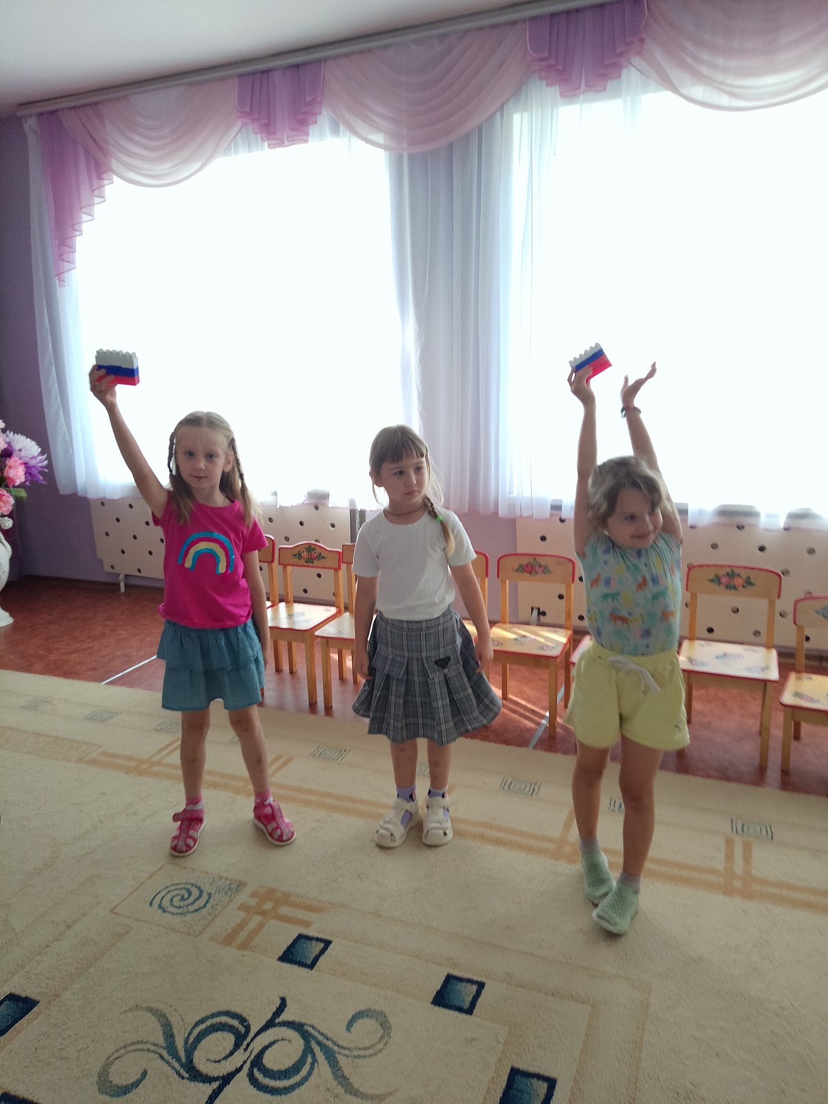 истории государственного флага, о гербе, громко читали стихи о флаге, исполнили флешмоб под песню "Белый, синий, красный", активно участвовали в аттракционе "Кто быстрее соберет Российский флаг" (из деталей конструктора "Лего").