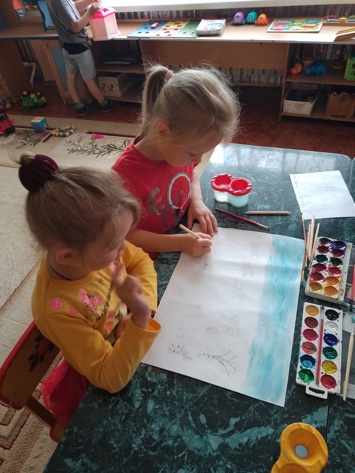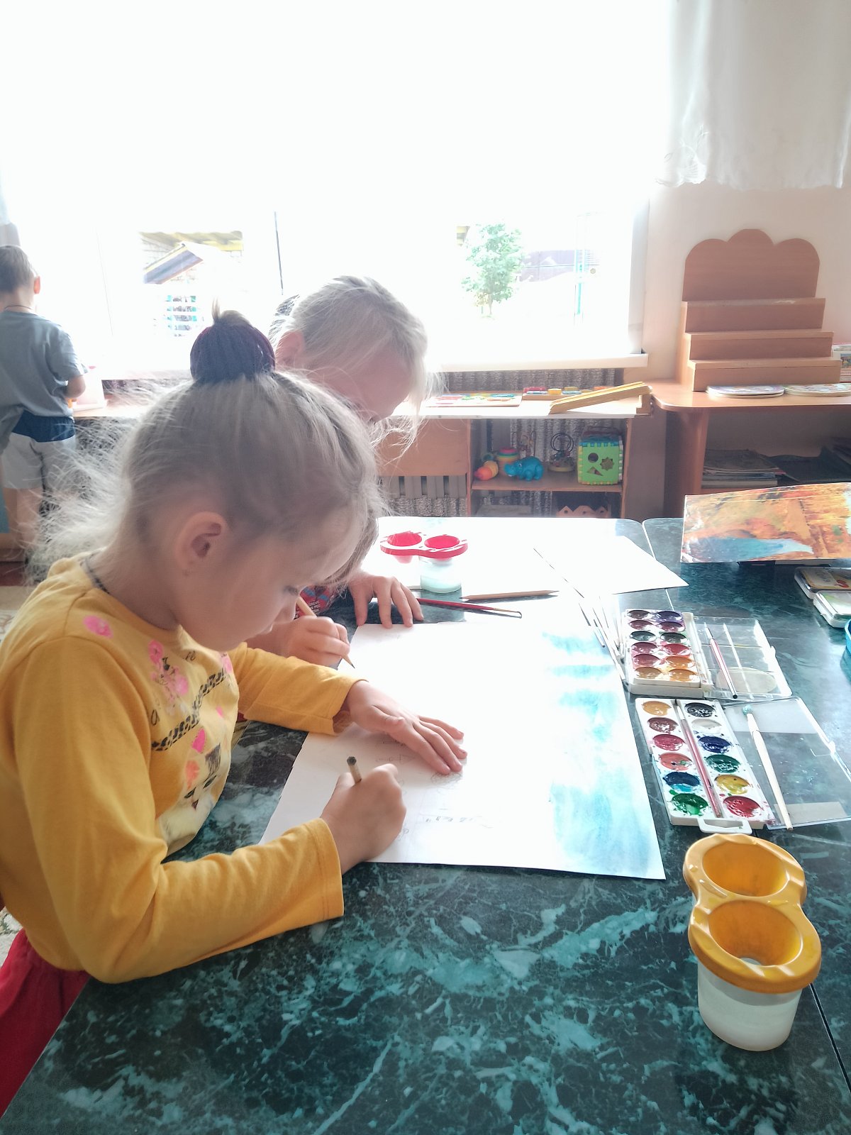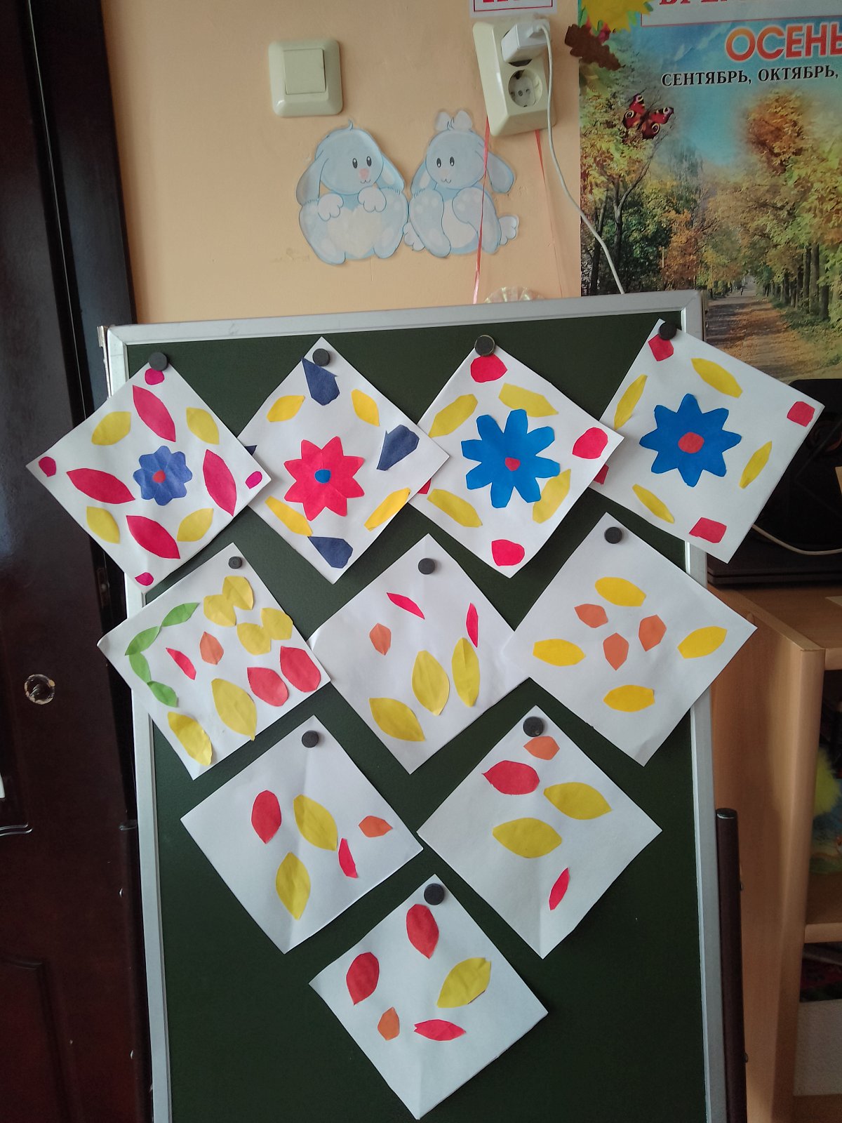 На занятиях старшие дети учились составлять рассказ по картине Левитана "Золотая осень" и создали коллективную работу: "Здравствуй, Осень!", а также все дети выполнили работу по аппликации "Осенний ковер".
