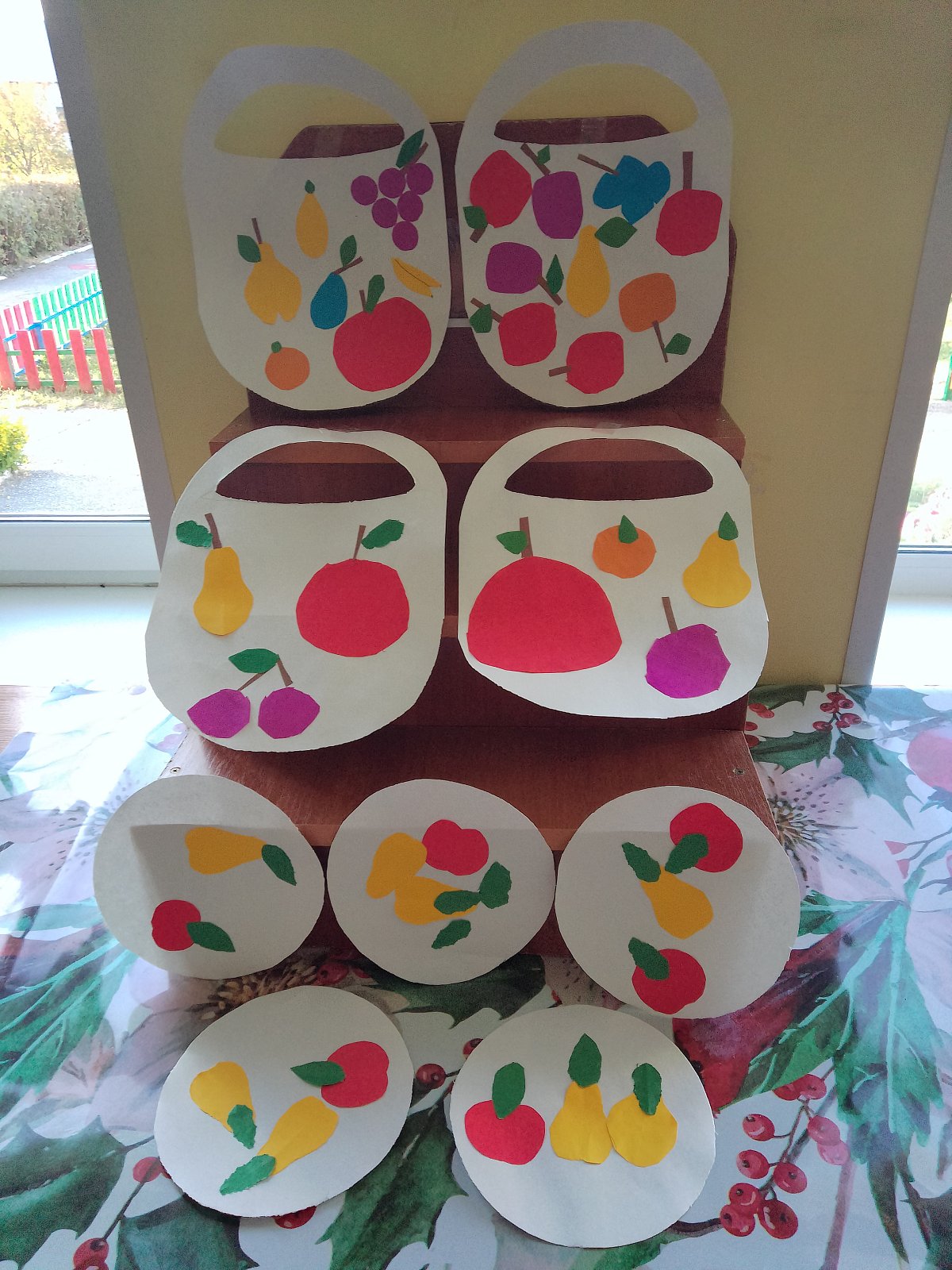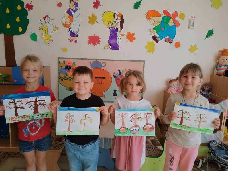 Дети отгадывали загадки, слушали сказку В. Сутеева "Яблоко". Дошкольники выполнили аппликацию "Корзина с фруктами", а малыши "Яблочки и груши лежат на тарелочке". Ребята рисовали "Фруктовый сад", где закрепляли технику рисования плодовых деревьев красками.