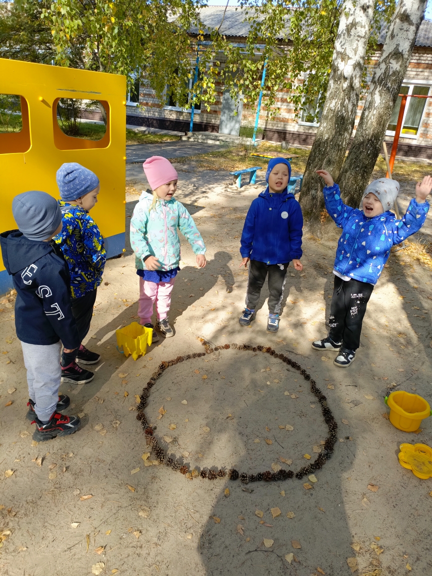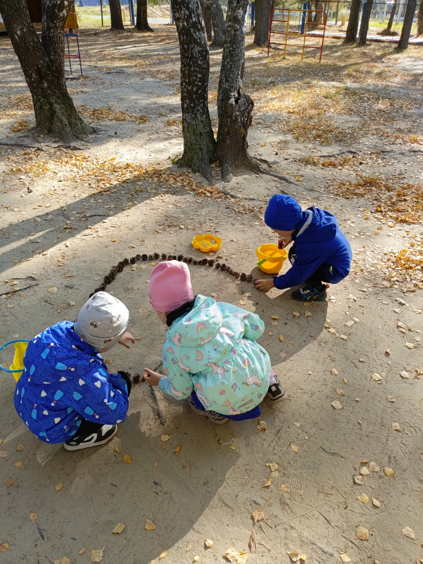 Интересной в этот день выдалась и прогулку. Ребята собрали сосновые шишки на участке детского сада и выложили из них яблоко. Яблоко из шишек удивило и порадовало ребят.