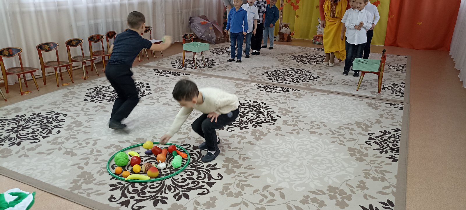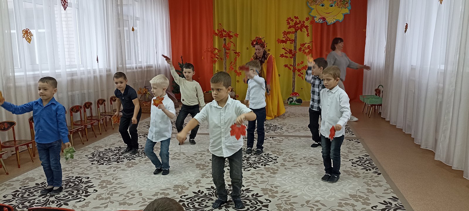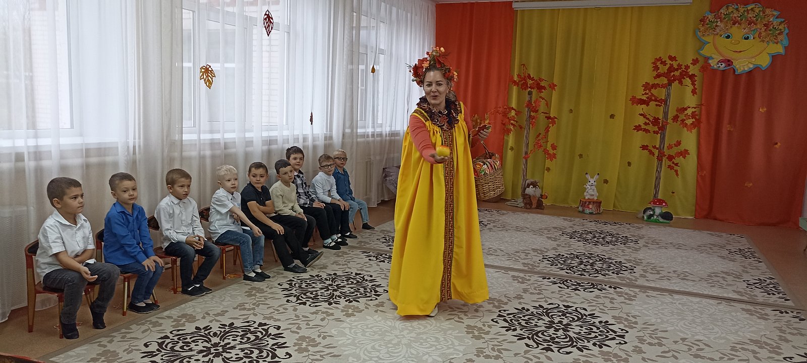 В гости к ребятам пришла «Осень», которая принесла детям осенние сюрпризы. На празднике дети пели песни, исполняли танцы, играли в веселые игры, водили хороводы, а так же отгадывали осенние загадки, рассказывали стихи, разгадывали звуки Осени (фонограмма) и даже рассказали осеннюю сказку с помощью шумовых инструментов. Самым ярким и запоминающимся эпизодом праздника стал сюрпризный момент – корзина с яблоками – подарок Осени!