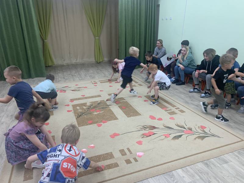 Дети вместе с мамами с удовольствием участвовали в предложенных конкурсах: рисовали мамам прически, дарили сердечки, выполняли логоритмические разминки, вспоминали детские песенки о маме. Закончилось развлечение совместным танцем.