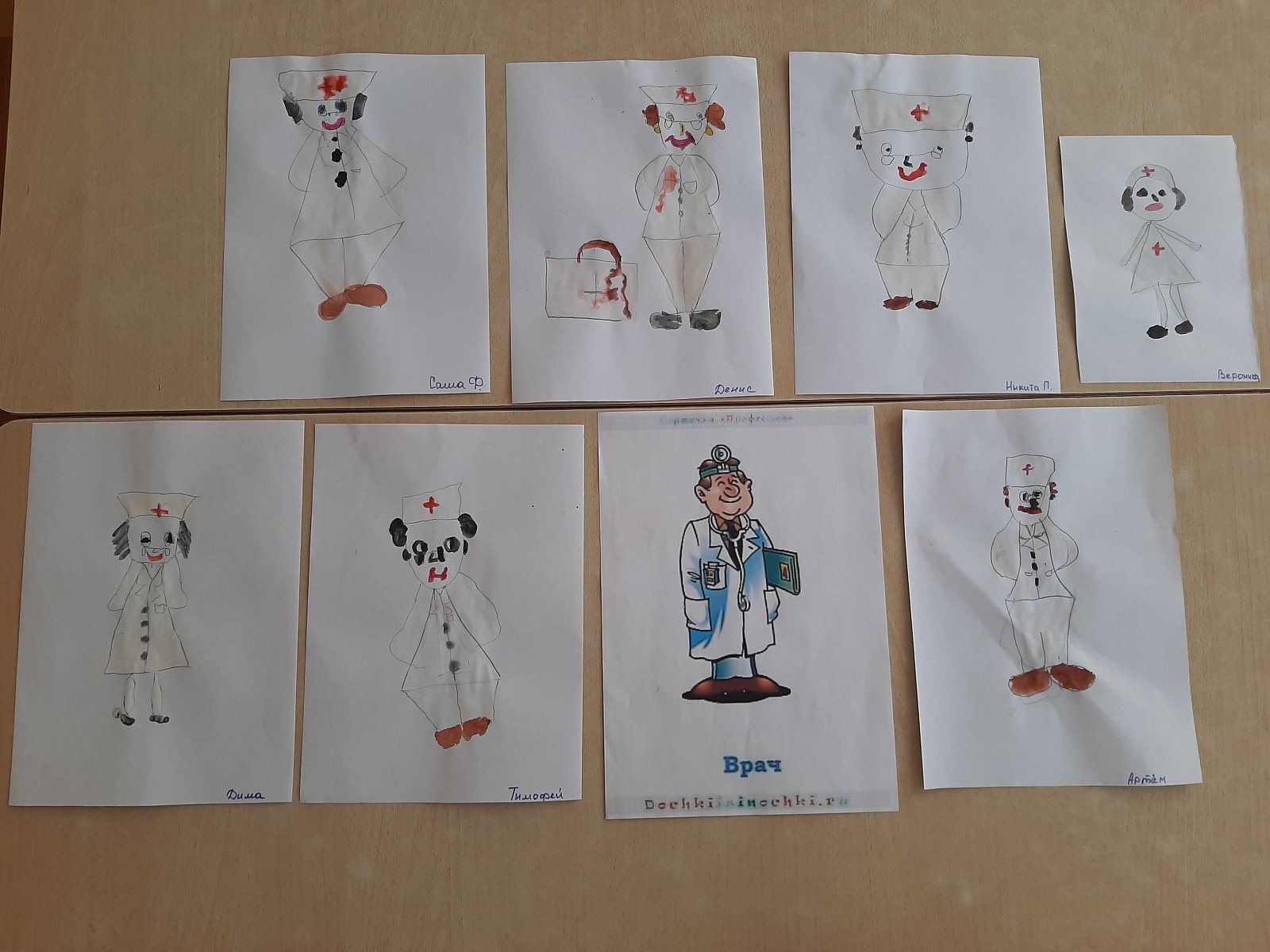 В течение недели с детьми были проведены беседы: «Кем ты хочешь стать?», «Все профессии важны», а также читали художественные произведения: «А, что у вас» С. Михалков, «Чем пахнут ремесла» В. Маяковский и др. Дети с удовольствием играли в дидактические игры: «Назови профессию», «Кто, что делает?», «Кому что надо»; сюжетные игры: «Поваренок», «Парикмахерская», «Больница», «Магазин»; настольные игры: лото «профессии», «ассоциации». На занятиях по художественно – эстетическому развитию ребята лепили, конструировали из геометрических фигур «Кому, что нужно для работы» и рисовали врача.