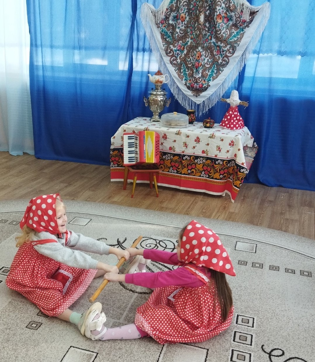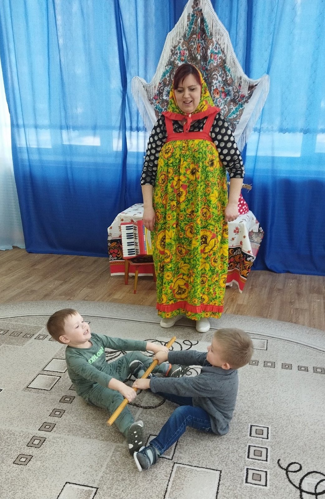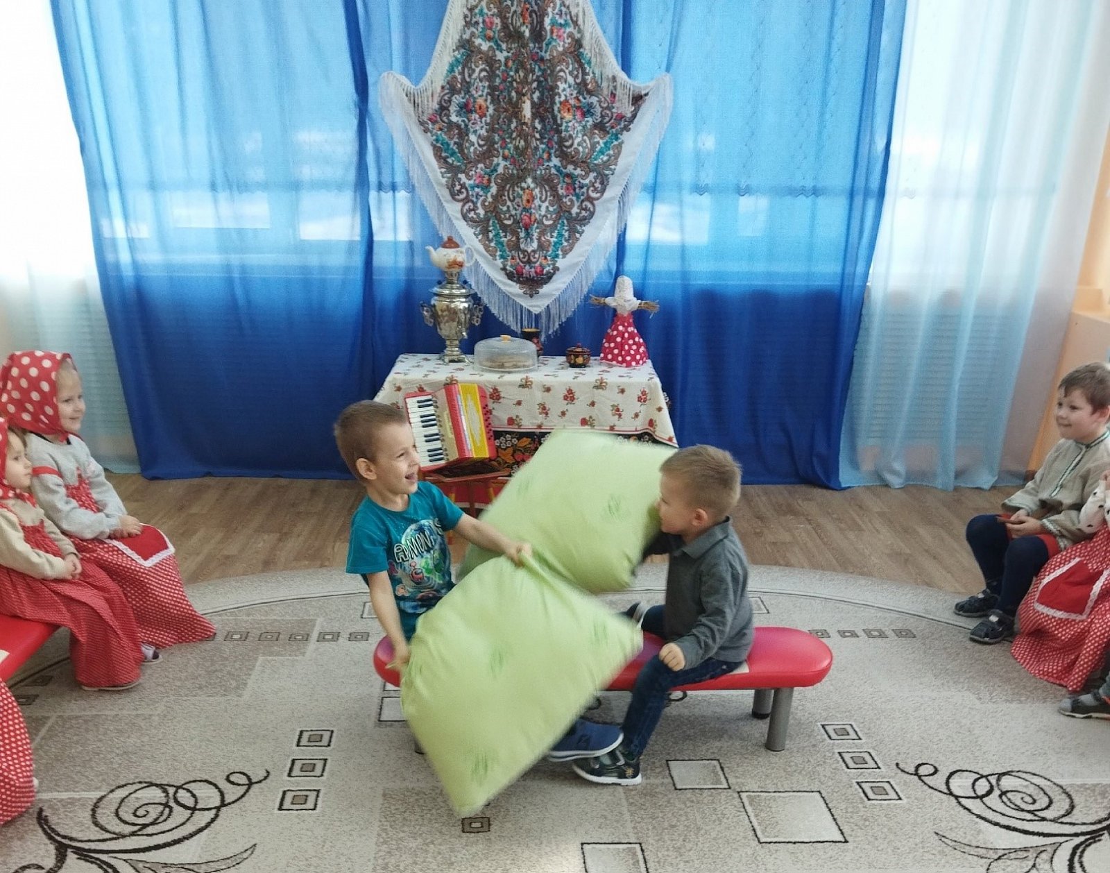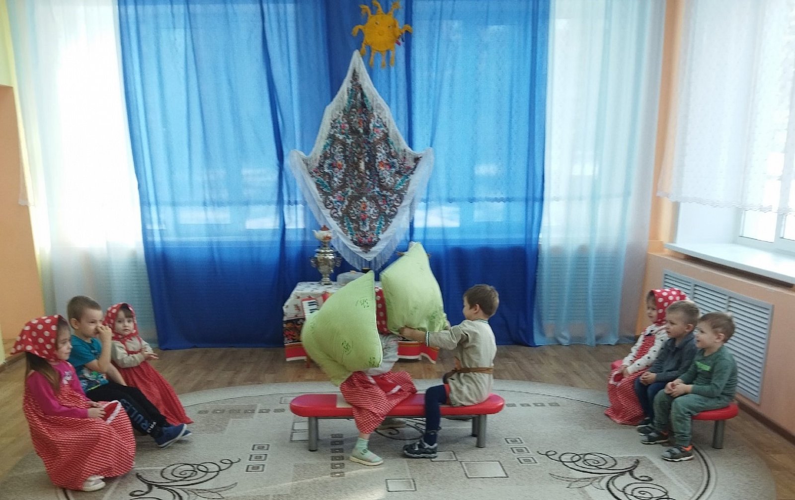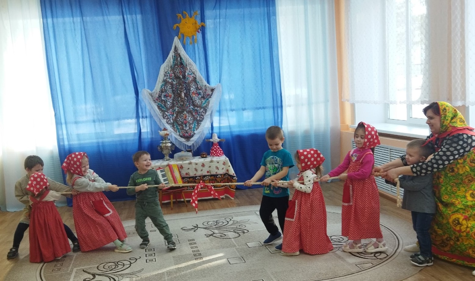 Ребята играли в русскую народную игру «Мед и сахар», участвовали в боях подушками, перетягивали канат, танцевали хороводную-игру «Тетя Весельчак», пели песни про весну и блины, отгадывали загадки.