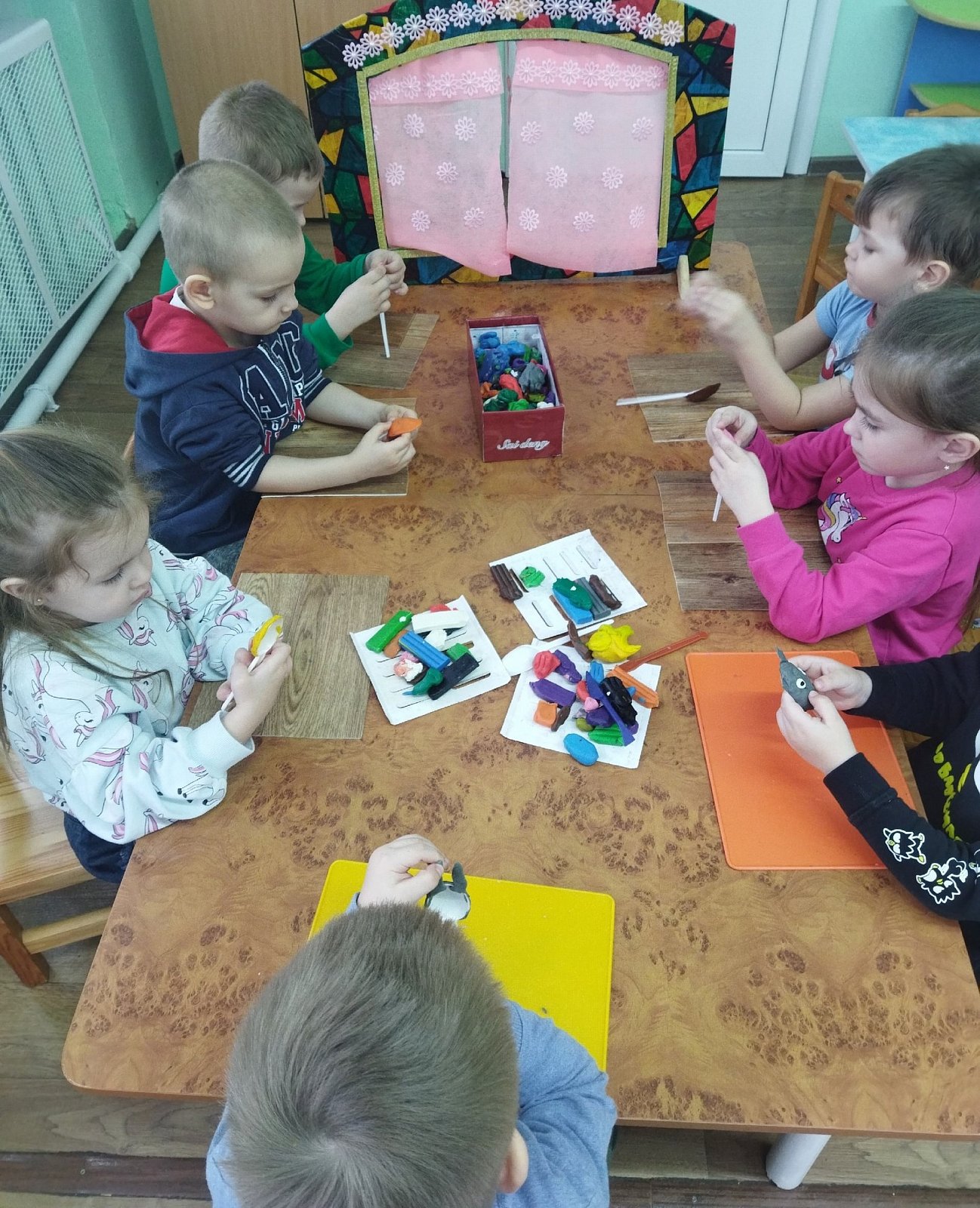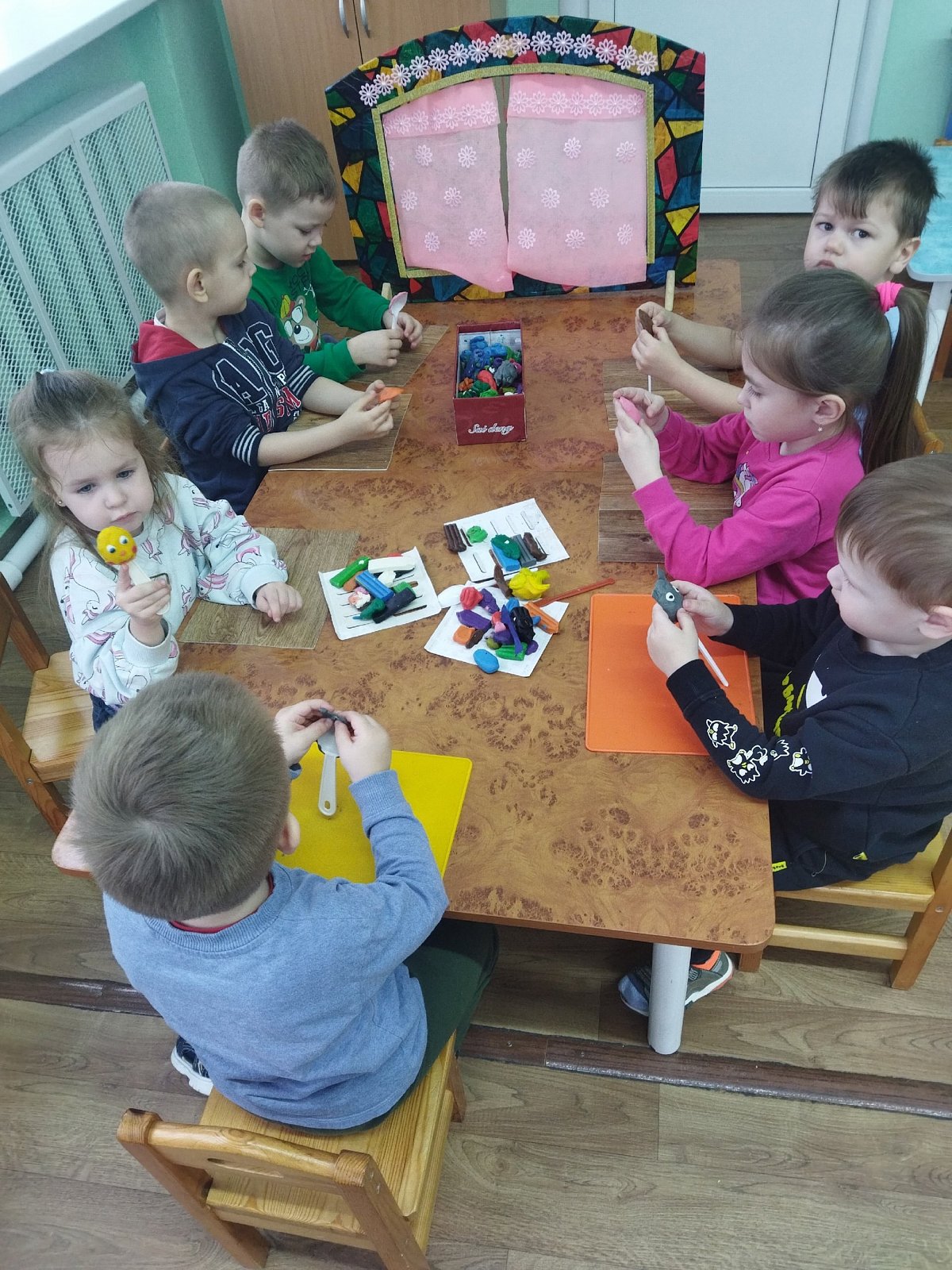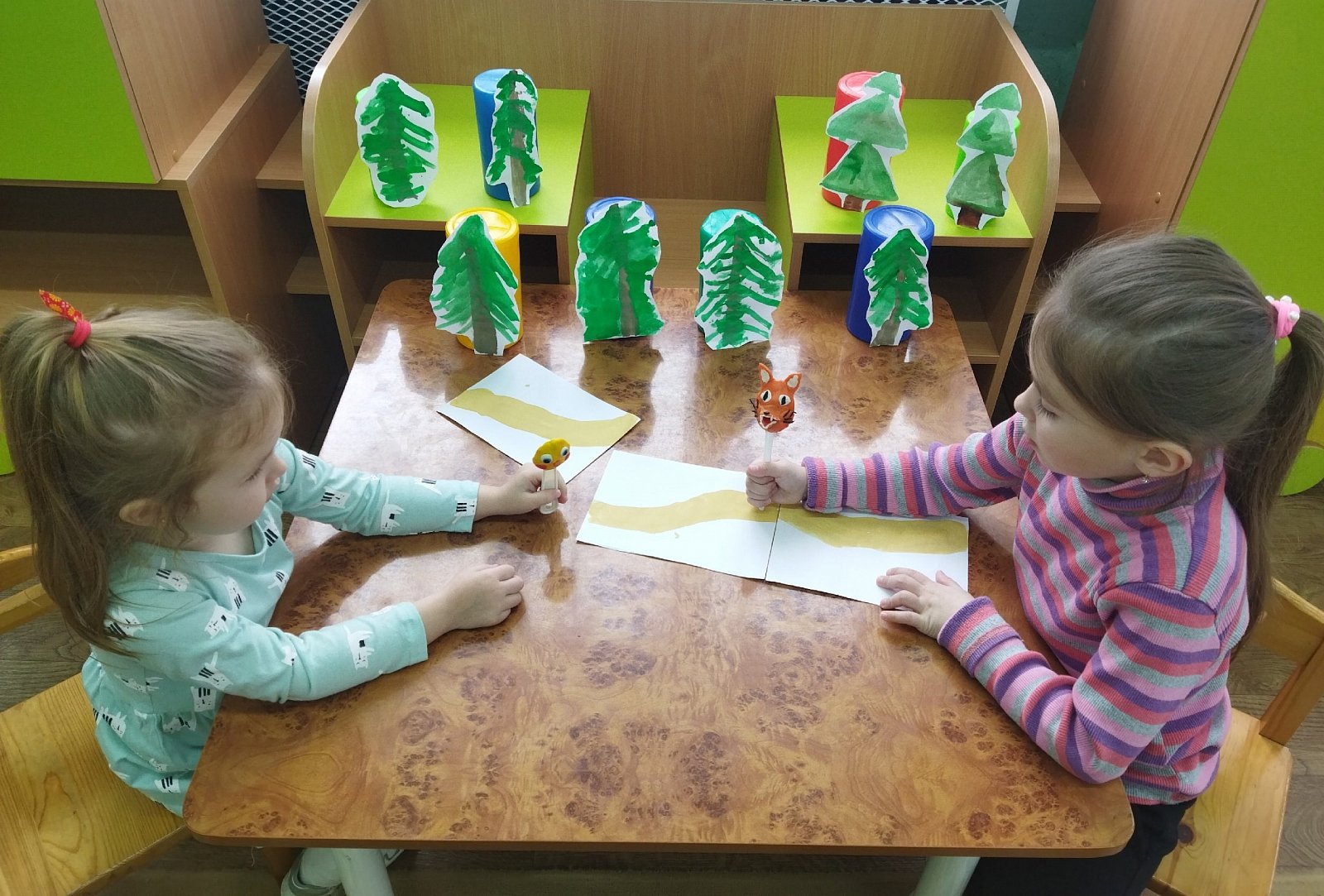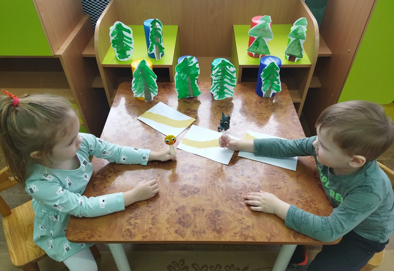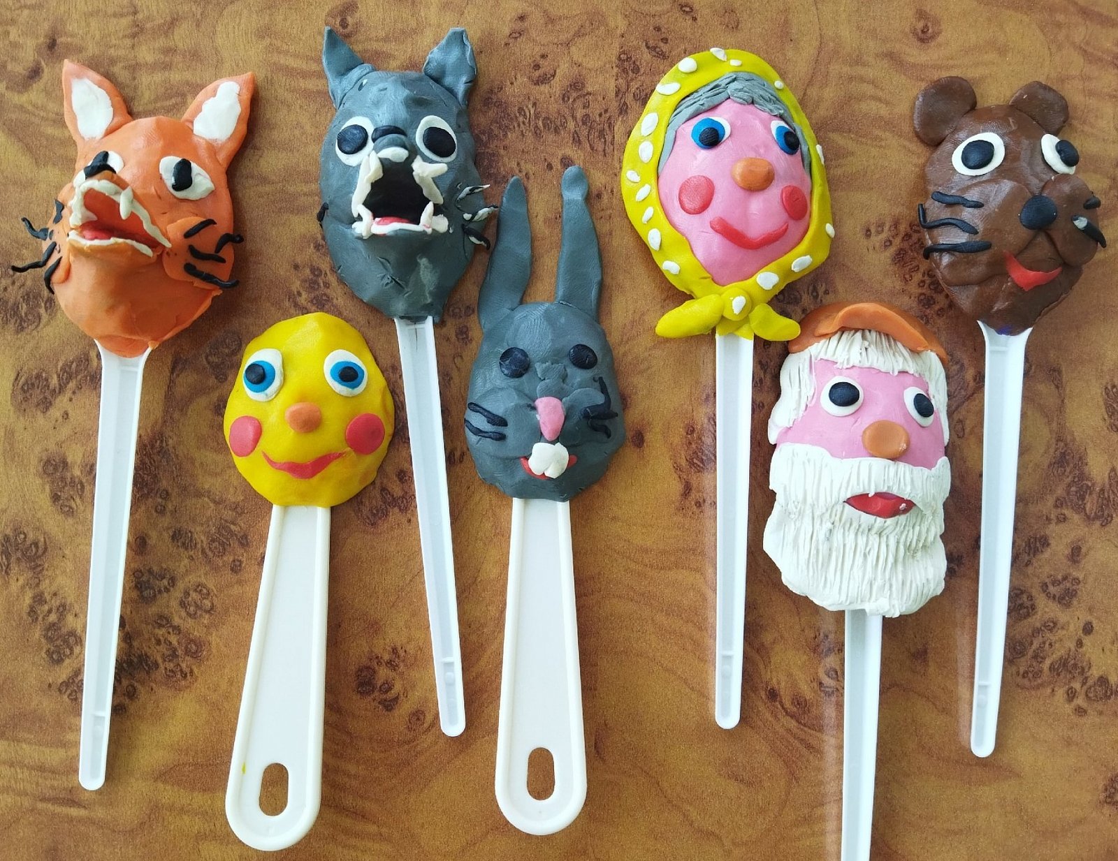 Так как в нашей группе нет ложкового театра, мы решили его сделать. В группе была организована творческая мастерская по изготовлению нарисованных декораций и ложковых кукол к сказке "Колобок" в технике пластилинография.