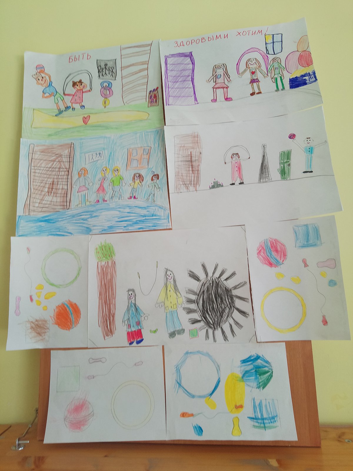 Провели с детьми НОД "Полезные и вредные продукты",отразили эту тему в аппликации.Старшие ребята рисовали "Как мы делаем зарядку", а младшие дети рисовали и раскрашивали предметы, которые мы используем во время проведения утренней гимнастики и на физкультуре.
