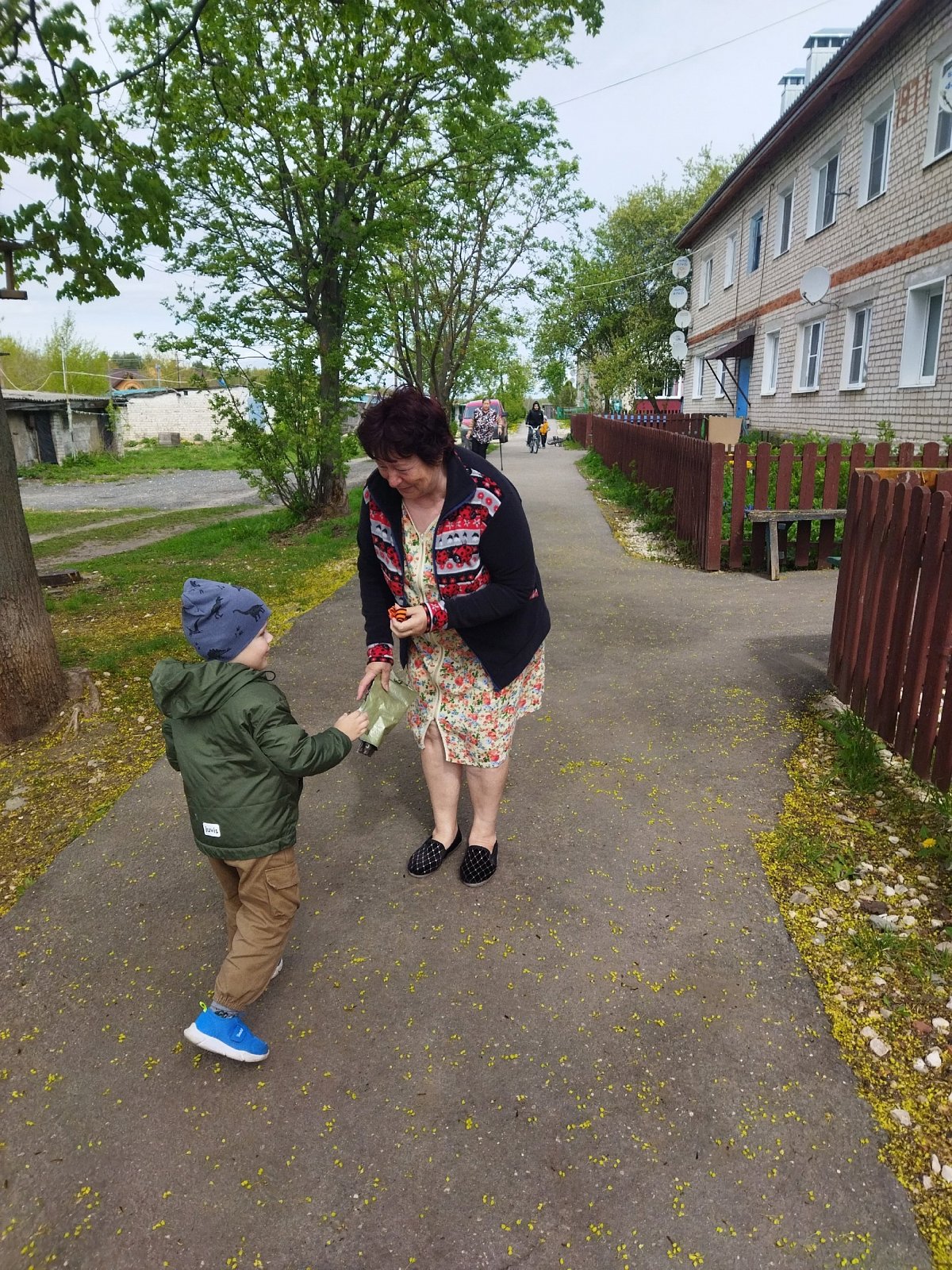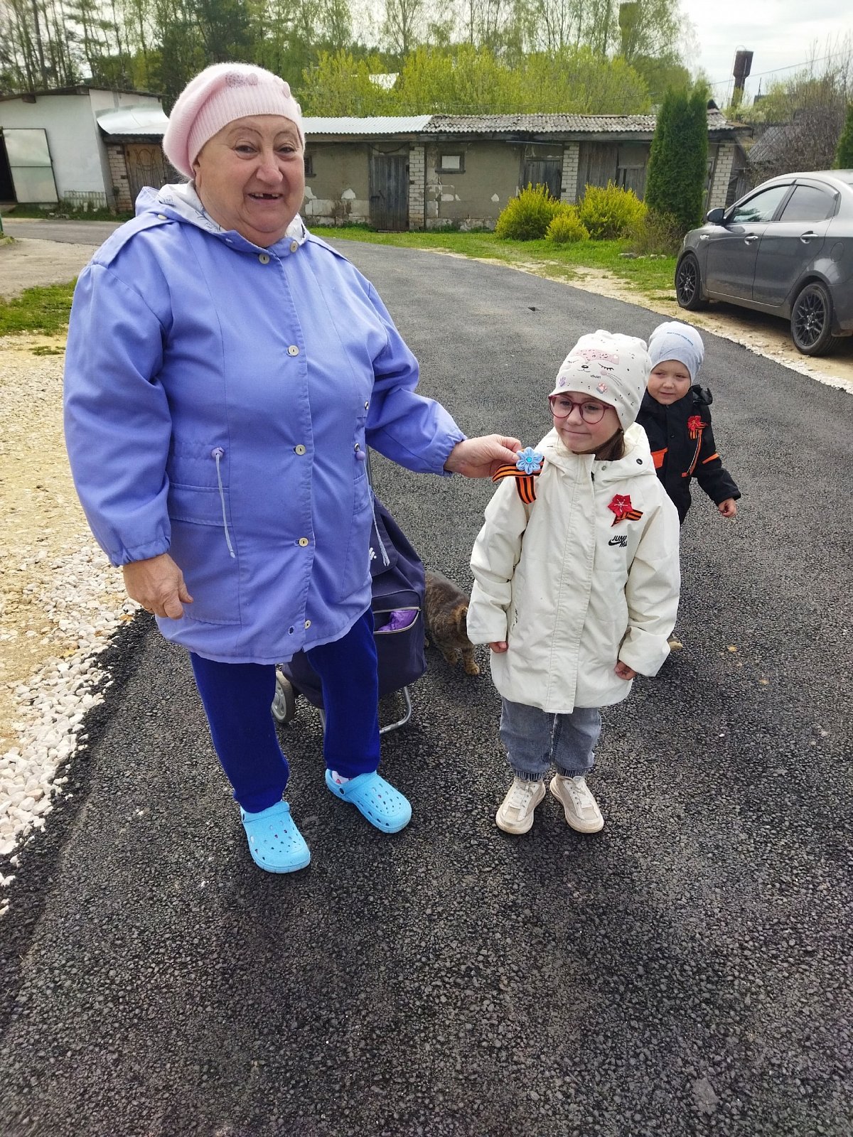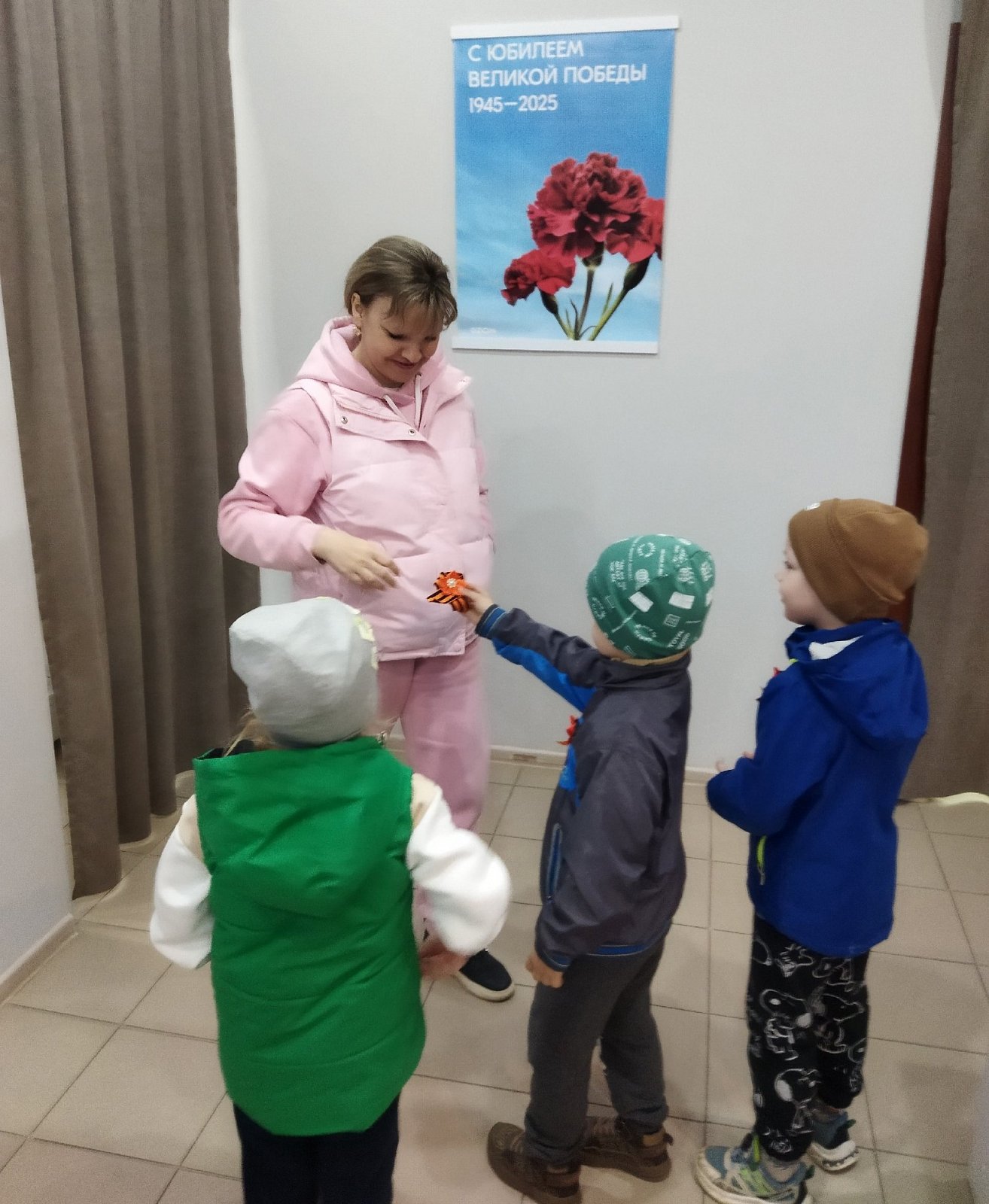 Изготовленные значки с Георгиевской лентой ребята подарили прохожим на улице и поздравили их с приближающимся 80-летие Великой Победы.