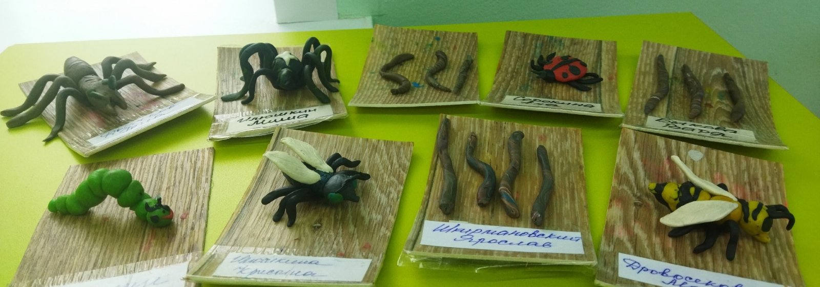 Ребятам было предложено слепить насекомого по желанию и по возрасту. Вспомнили приемы лепки и каждый создал свой образ насекомого. Дети постарше слепили пчелу и муху, ребята помладше - гусеницу, паука, божью коровку и муравья, а малыши слепили червячков.
