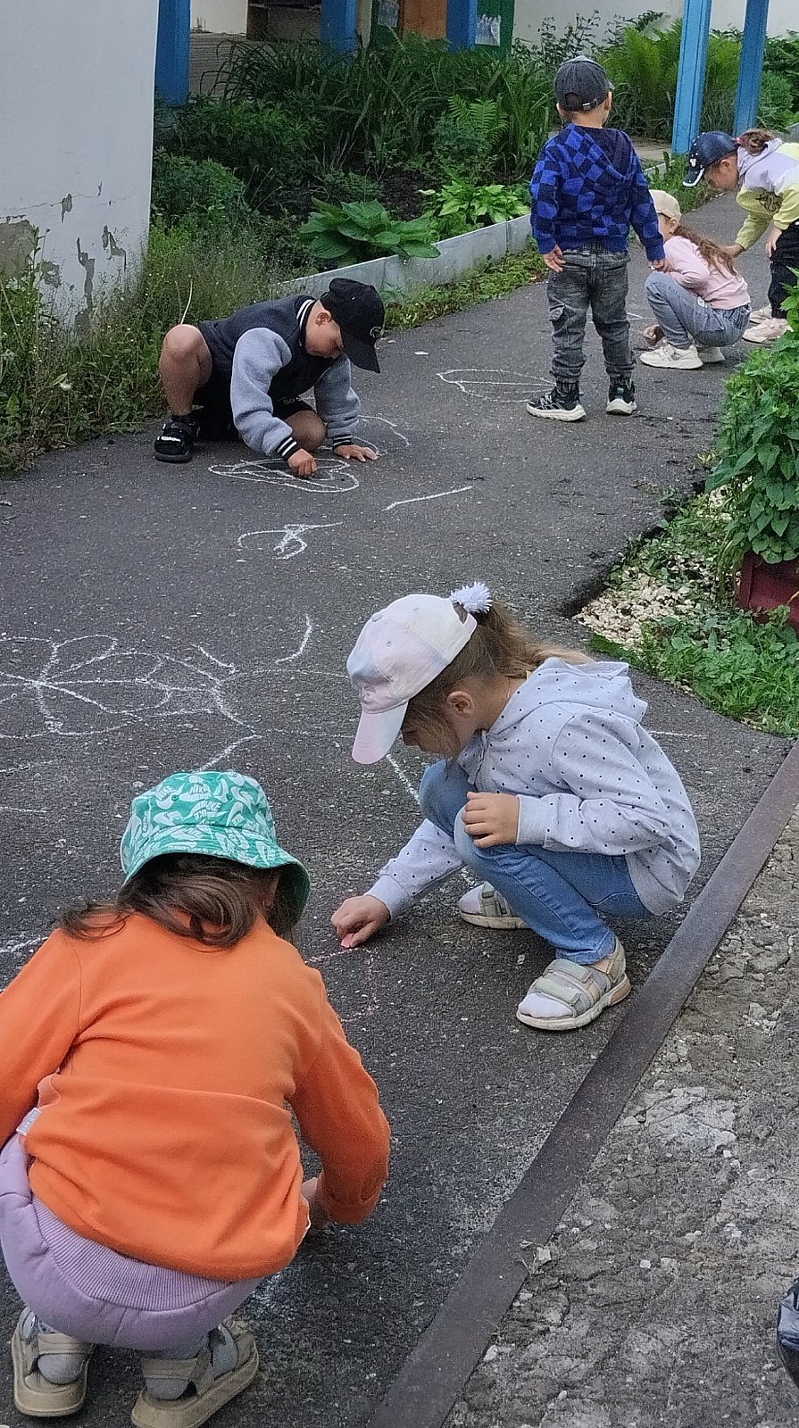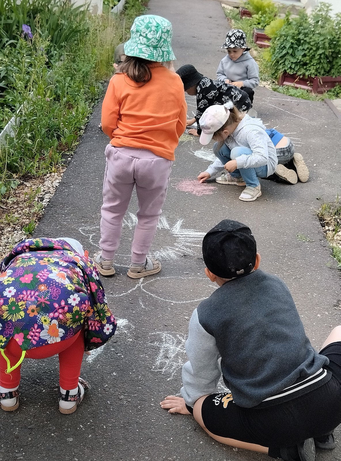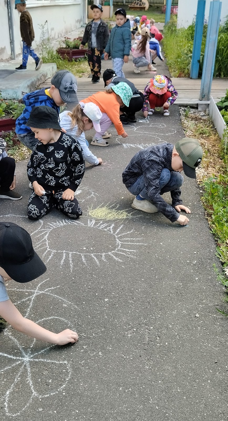 Воспитатели провели беседу" Что такое лето. " Отгадывали загадки про лето, поиграли в подвижные игра, рисовали лето цветными мелками на асфальте.