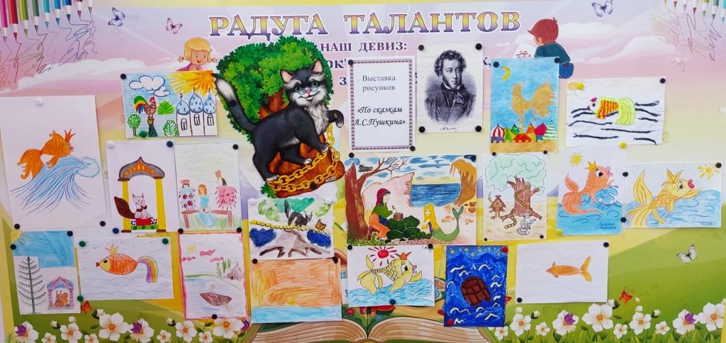 День А.С. Пушкина начался с выставки книг и портрета великого русского поэта. В этот день к ребятам приходили сотрудники поселковой библиотеки с презентацией о творчестве А.С.Пушкина. Дети с интересом играли в игры и забавы времен Пушкина: «Жмурки», «Собери изумруды», «Центон» и др., складывали пазлы к сказкам, а также в преддверии праздника дети нарисовали рисунки по сказкам А.С. Пушкина.