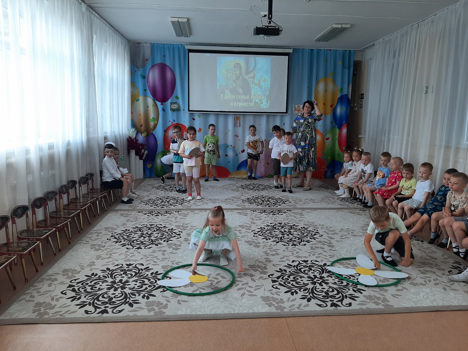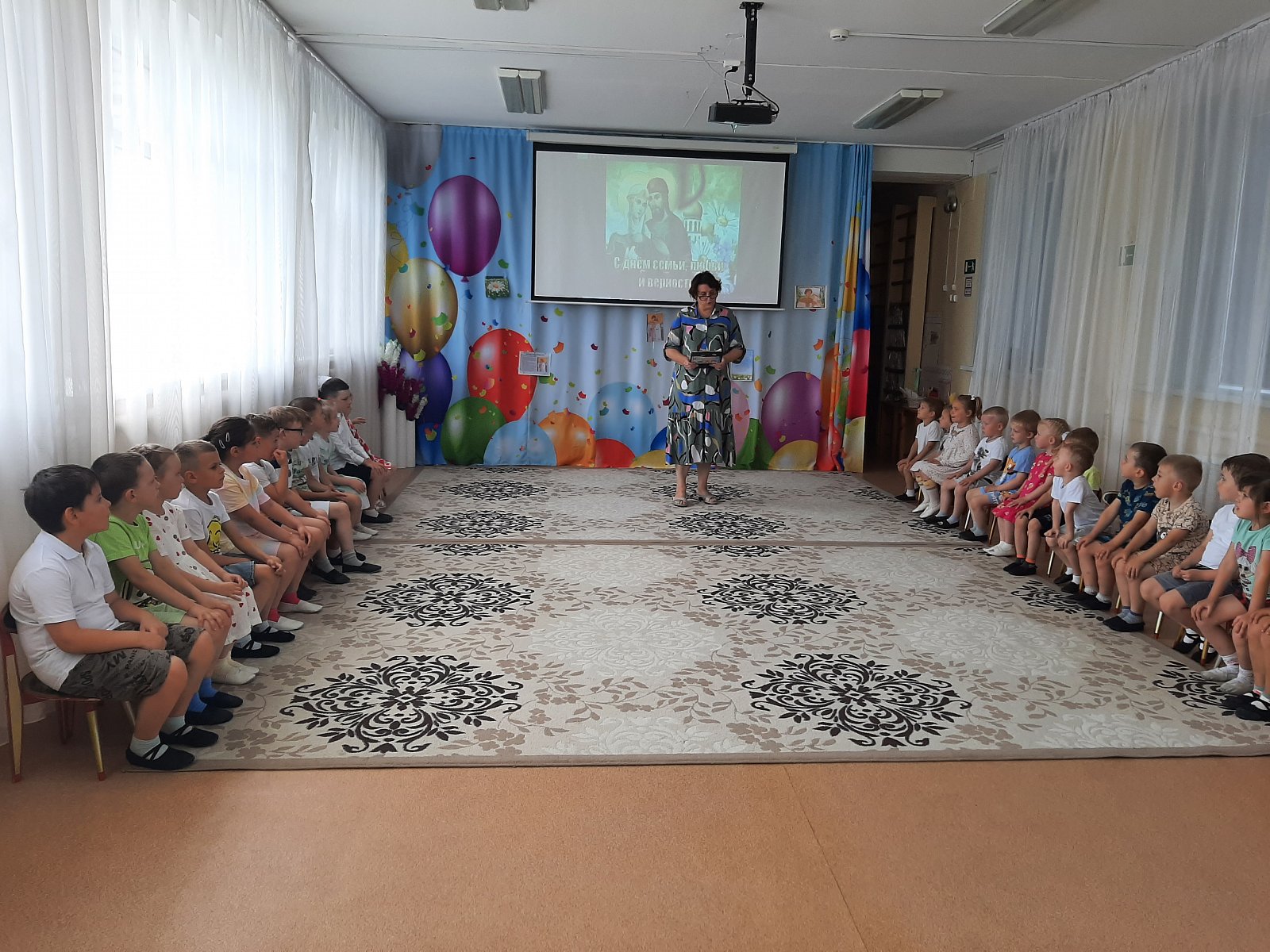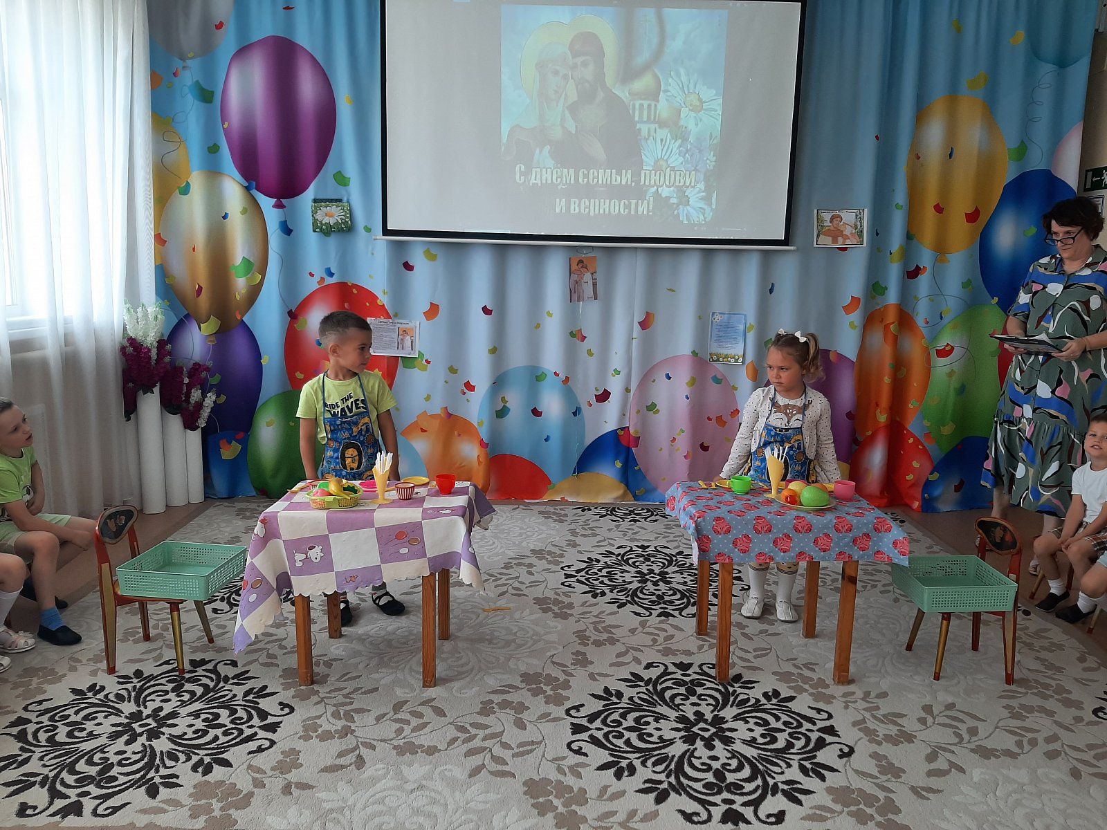 Вот и в нашем детском саду «Теремок» посёлок Первомайский весело и душевно отметили День семьи, любви и верности! Дети узнали о возникновении этого замечательного дня, историю святых Петра и Февронии Муромских, чей союз является образцом верности, любви и семейных ценностей. Во время праздника ребята читали стихи, отгадывали загадки, участвовали в конкурсах «Собери ромашку», «Накрой стол», «Уборка квартиры», «Весёлый платочек», а в завершении праздника дети исполнили танец «Дружба – это не работа».