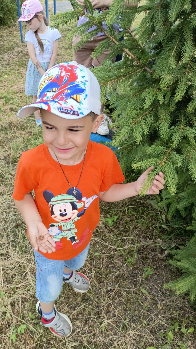 На прогулке удалось увидеть муравейник, а на лапе ели один из ребят нашел улитку!