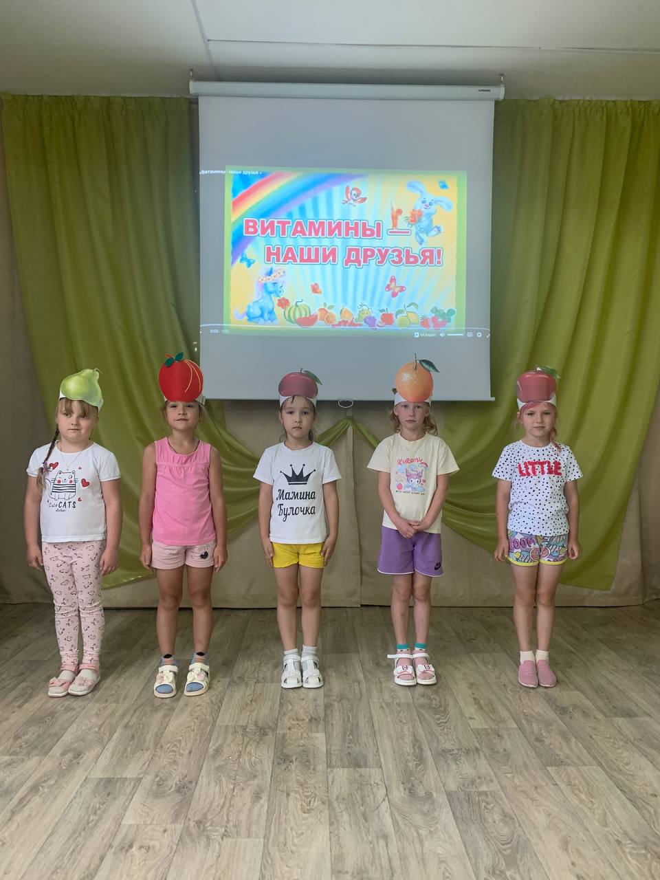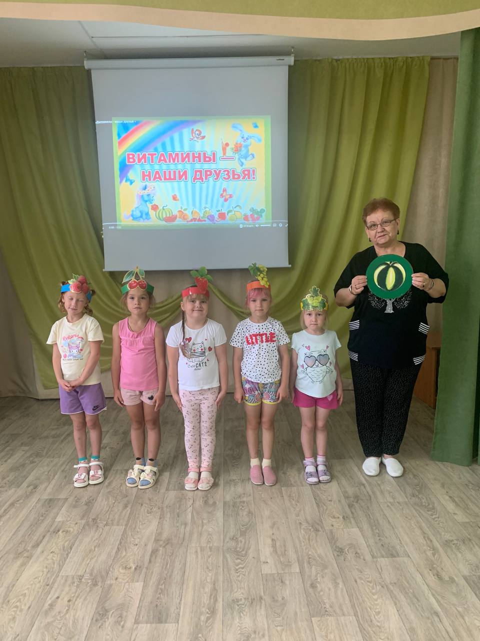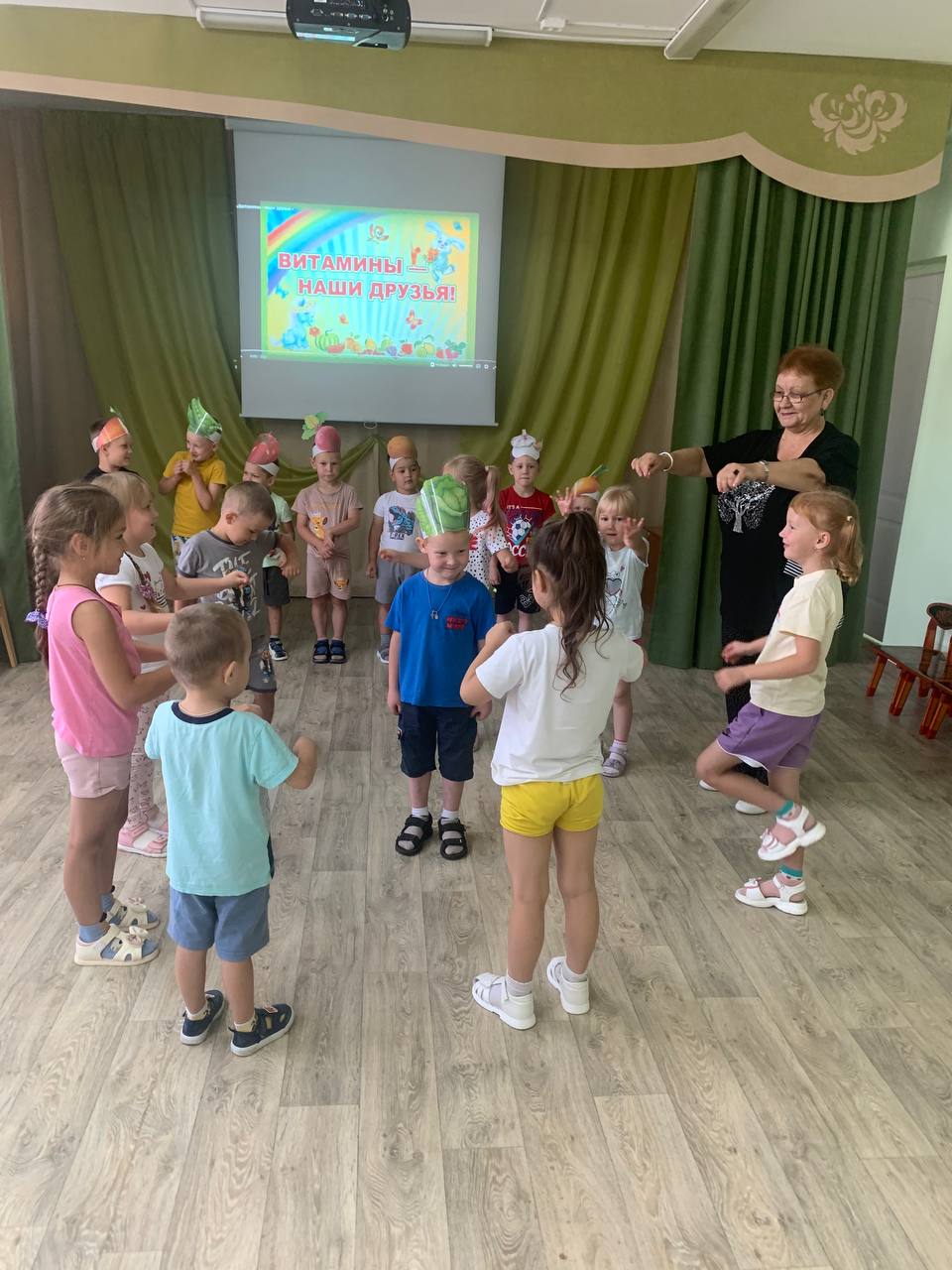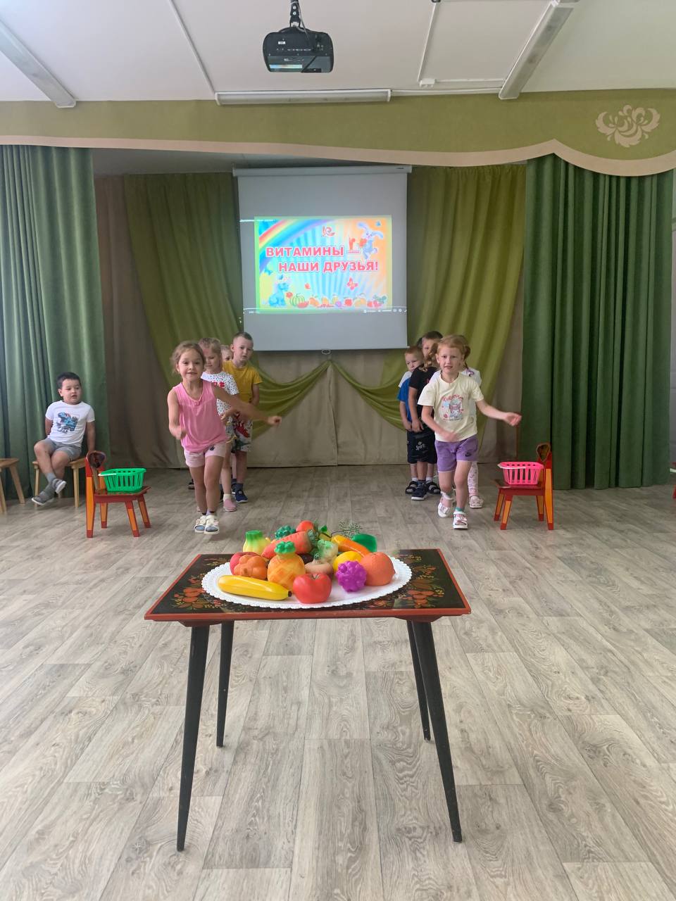 08.08. В МБДОУ д/с «Теремок» (п. Новый) в старших группах прошло развлечение «Витаминная семья». С целью расширения представлений об овощах, фруктах и содержащихся в них витаминах, показали детям презентацию «Витамины». Ребятам было интересно и познавательно. В споре о пользе витаминов участвовали дети, наряженные в шапочки овощей и фруктов. Выяснилось, что витаминами богаты и овощи, и фрукты. Не забыли и про ягоды, которые всем очень полезны! Дети танцевали, пели, веселились, играли в спортивные игры – аттракционы. Они узнали, какие бывают витамины, в каких овощах и фруктах содержатся, для чего необходимы людям.