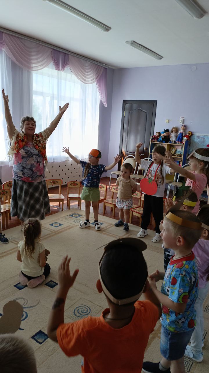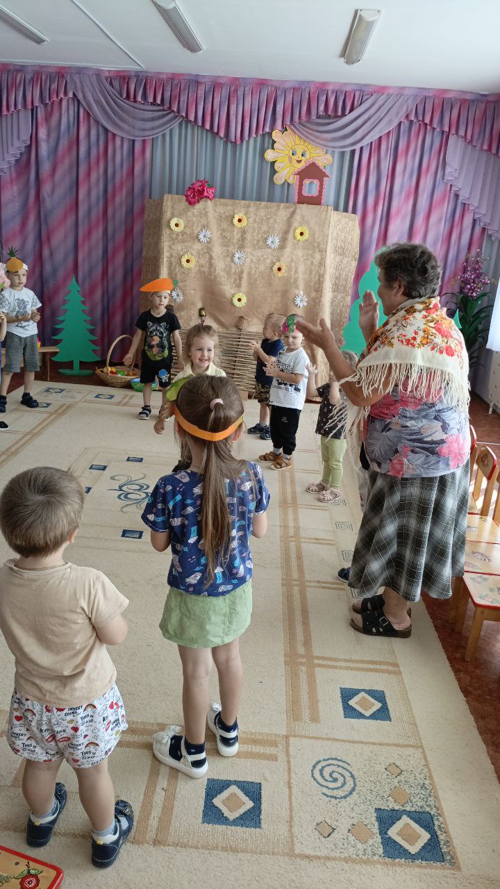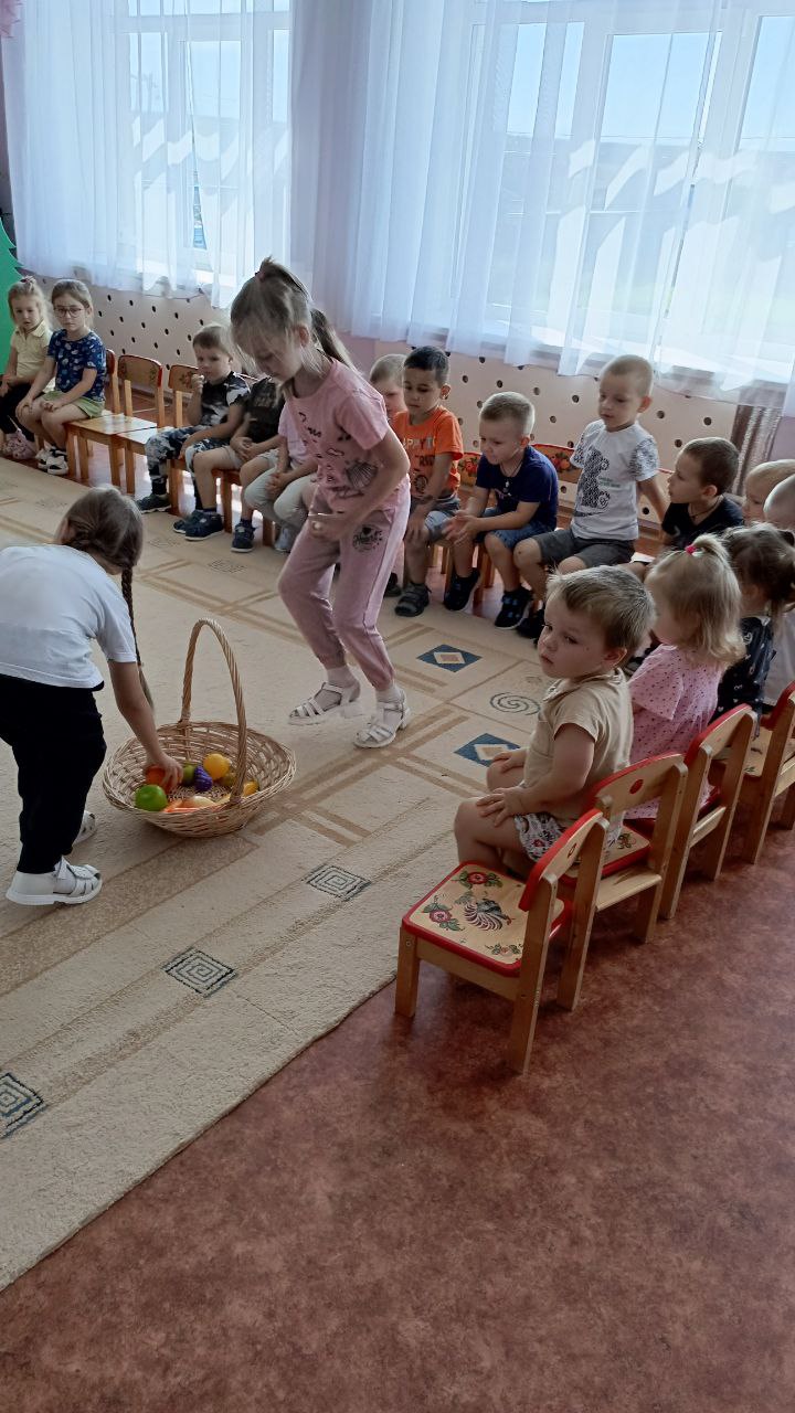 В рамках тематической недели "Летом отдыхаем- про витамины все узнаем!", педагоги Сорокина С.С. и Соколова Н.В. подготовили для детей развлечение "Есть у нас огород...", где пришла в гости к ребятам бабушка Дуня с корзиной овощей и фруктов, попросила детей помочь разобрать по корзинкам овощи и фрукты,дети легко справились с заданием, ребята отгадывали загадки про овощи и фрукты, рассказали бабушке,какие заготовки на зиму можно приготовить из них и какие вкусные блюда получаются из овощей и фруктов, активно участвовали в хороводе "Есть у нас огород...", Соколова Н.В. провела с детьми веселую, народную игру "Блины" и пояснила, что можно печь блины, оладьи из кабачков и яблок.
