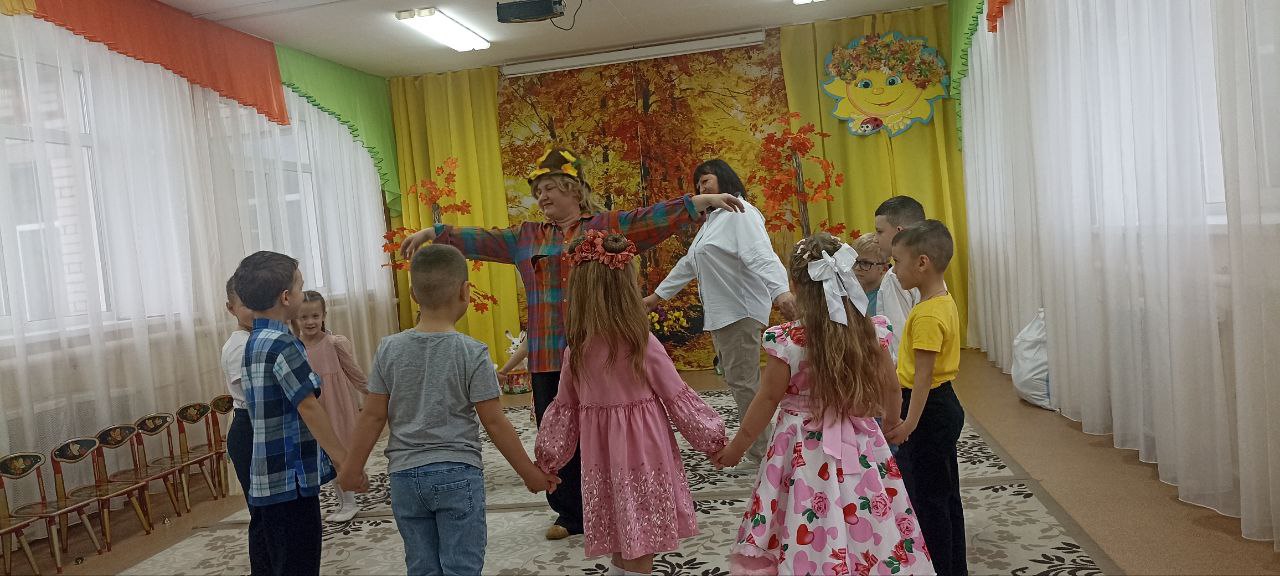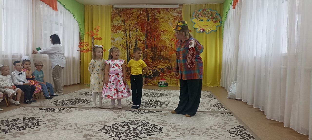 На дворе было пасмурно, моросил дождь, не хватало солнышка, а в музыкальном зале царила теплая, доброжелательная атмосфера. В гости к ребятам конечно же пришла красавица Осень. Для нее дети приготовили музыкальные подарки – оркестр «Осеннее настроение в лесу», «Осенний дождик» и др. Вместе с гостьей дети пели песни, читали стихи, отгадывали загадки. После прощания с Осенью к дошколятам неожиданно явилось Пугало огородное, которое принесло много веселых игр и аттракционов.