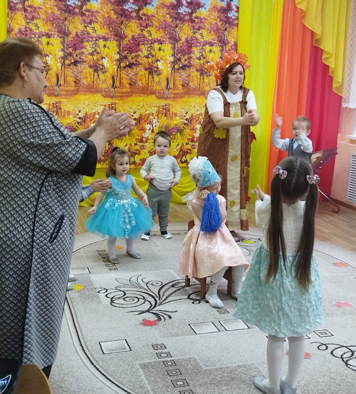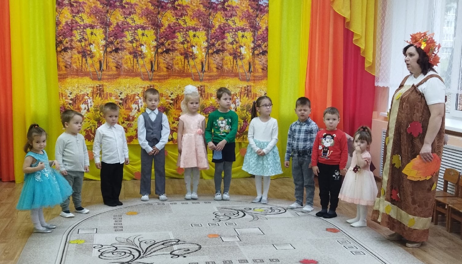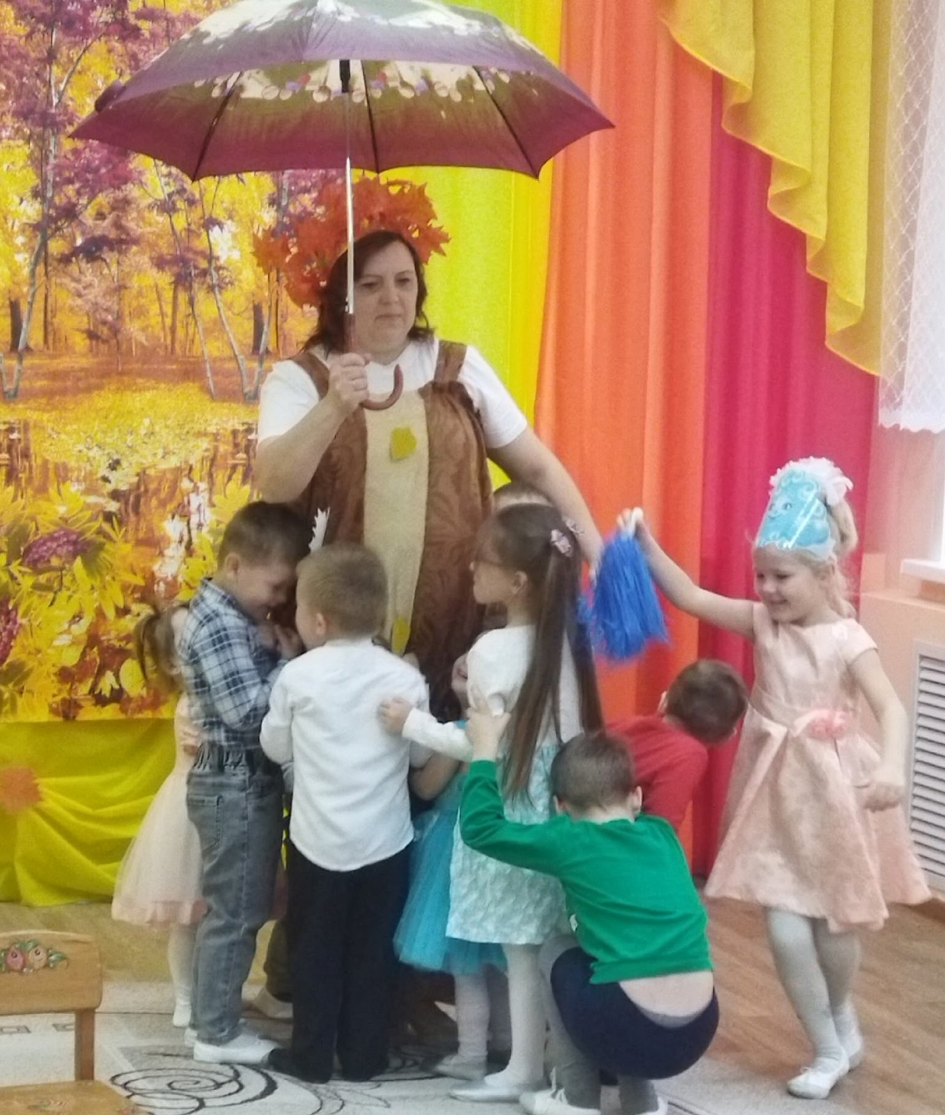 И хоть осень и называют «унылой порой», тем не менее, кто как не дети больше всего радуется ярким разноцветным листьям, опавшим с деревьев, дождику под которым так интересно гулять под зонтиком в резиновых сапожках. В честь волшебницы Осени был устроен настоящий праздник!