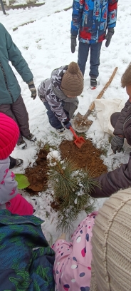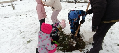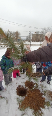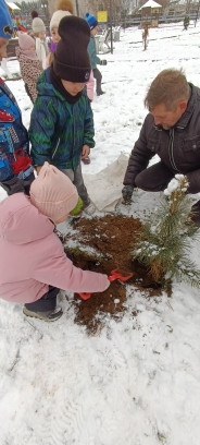 Дошкольники с восторгом разглядывали маленькие пушистые деревца, бережно брали их в руки и аккуратно помещали в лунки, закапывали и поливали.