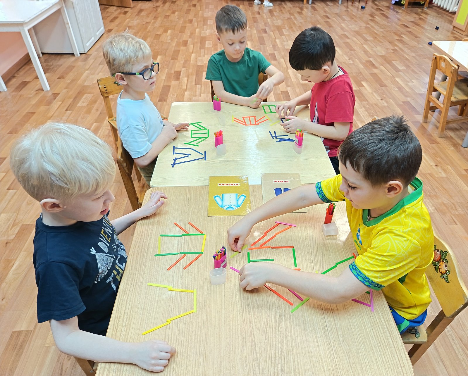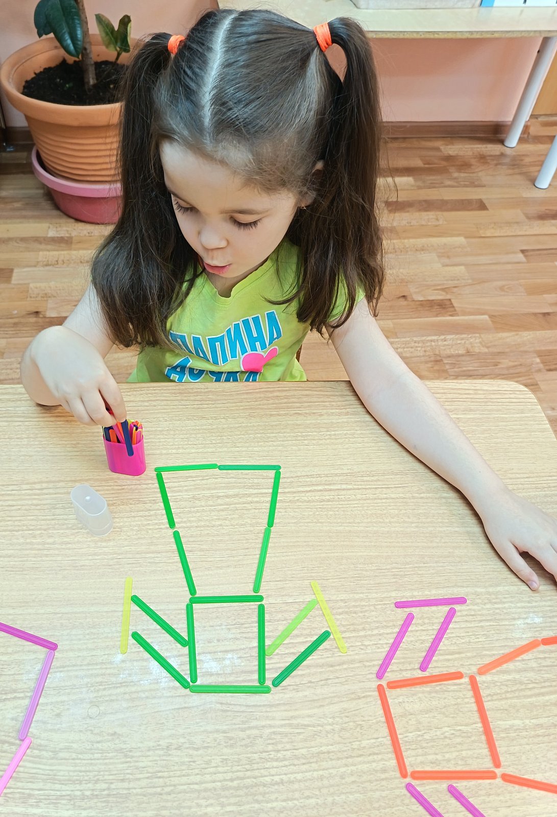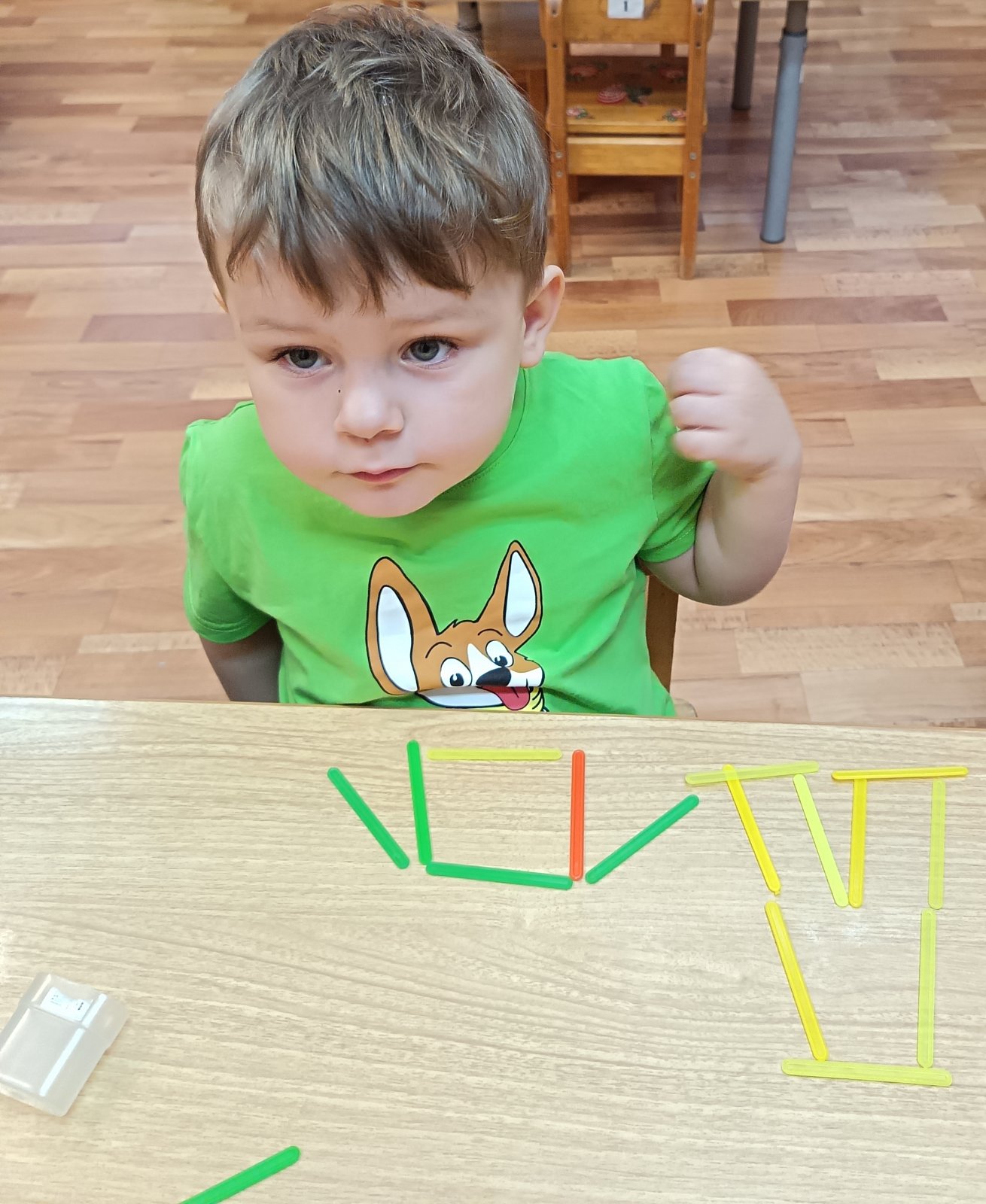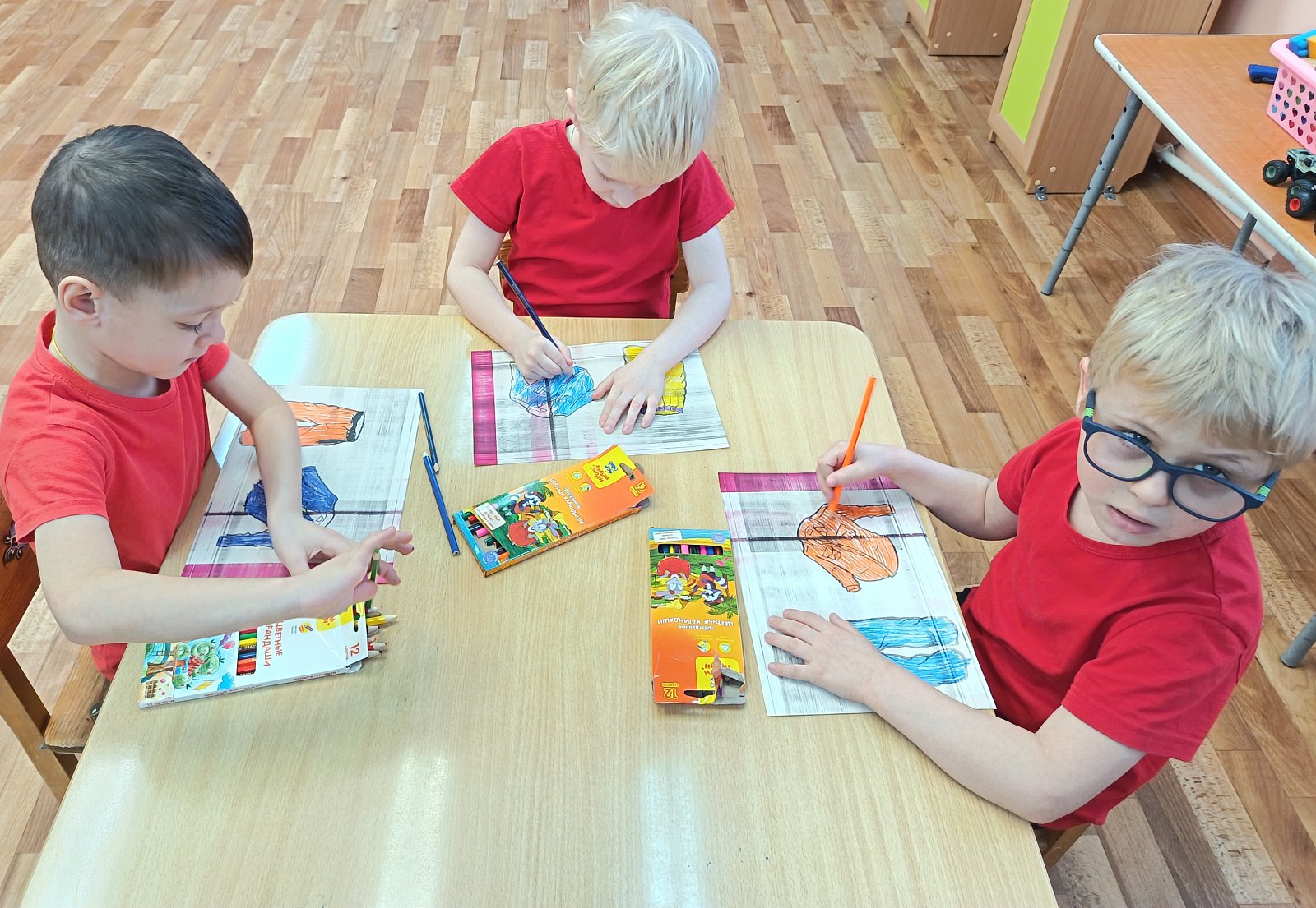 У ребят отметилось повышение речевой активности, активизация словаря по теме «Одежда». В продуктивной деятельности дети занимались пластилинографией – укрась свитер, конструировали из счетных палочек и раскрашивали одежду.