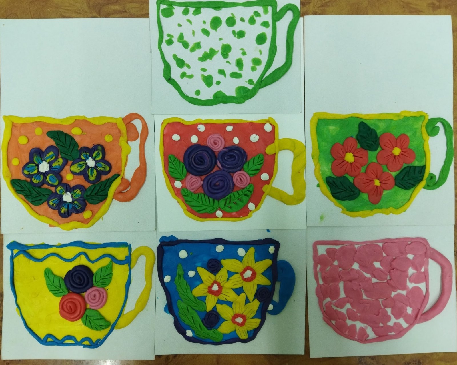 Прежде чем приступить к лепке, ребята вместе с воспитателем Сорокиной Татьяной Владимировной рассмотрели картинки и обсудили, какая бывает посуда, из чего ее делаю, для чего она служит. Когда вся информация была получена, дети выбрали в качестве подарка для мамы бокал, который нужно было выполнить в технике пластилинография.