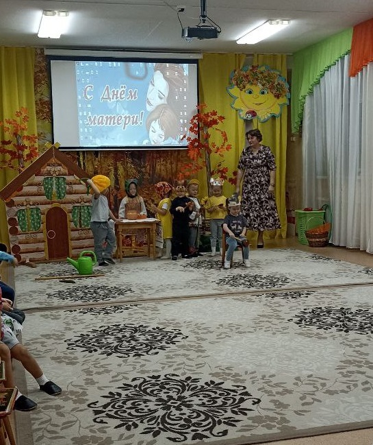 Воспитанники читали стихи своим мамам, дети вместе с мамами дети участвовали в эстафетах: «Собери солнышко», «Уборка квартиры», «Собира-ем овощи». А еще показали сказку «Репка» для мам.