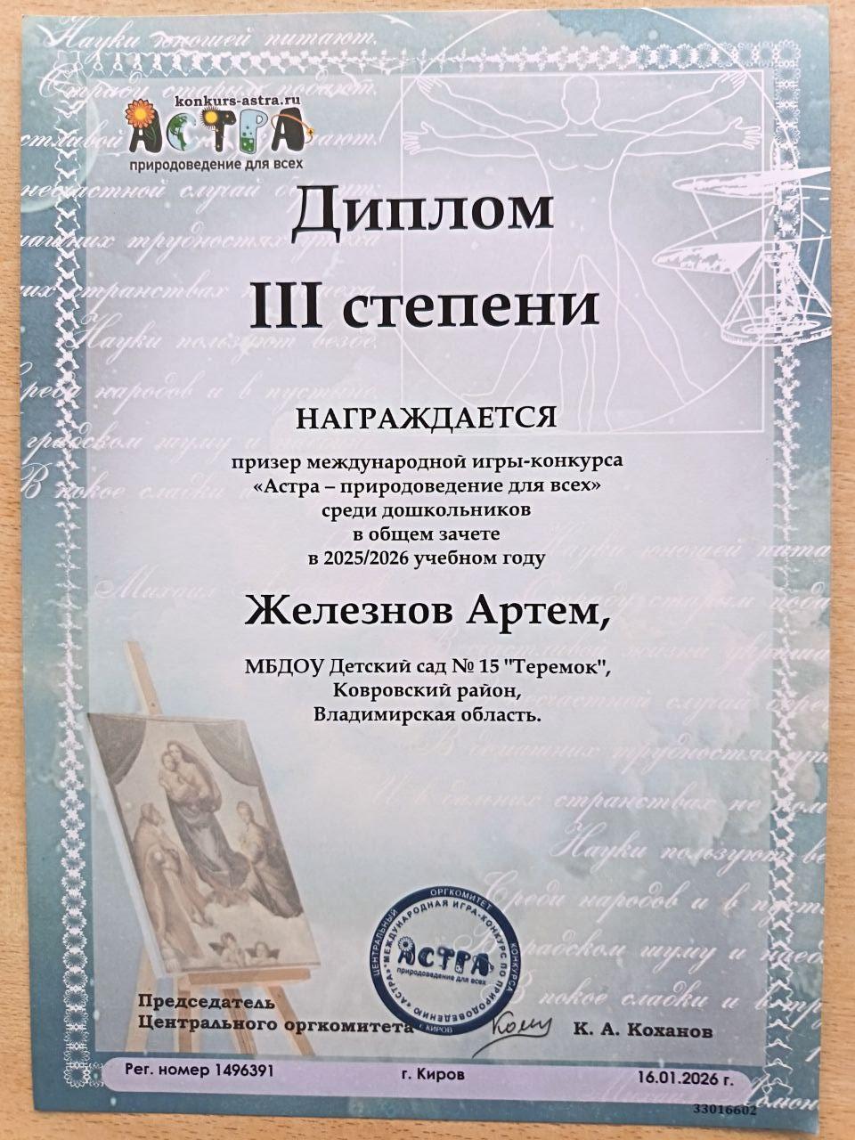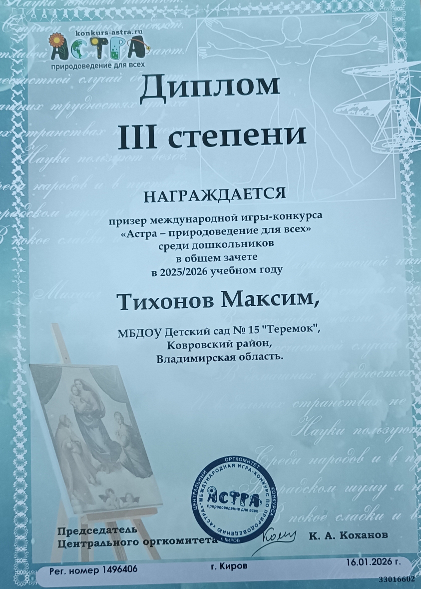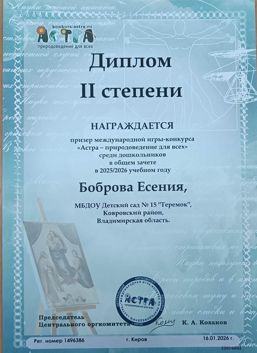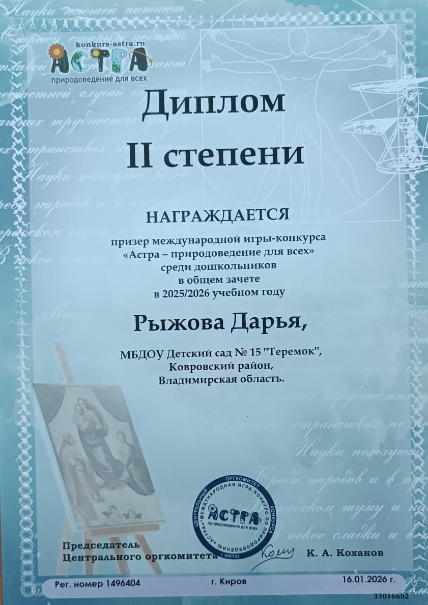 В конце ноября 2024 года наши воспитанники групп «Ручеек» и «Ягодка» приняли участие в международной игре -конкурсе среди дошкольников "Астра - природоведение для всех".