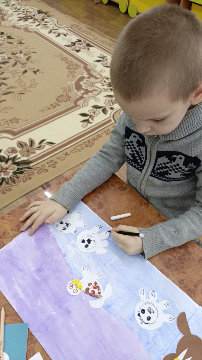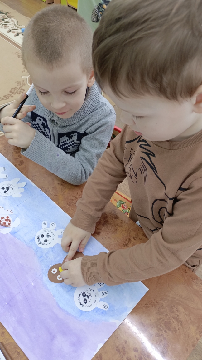 Дети сами выбирали то животное, которое хотели бы изобразить. При выполнении этой работы всех ребят охватило вдохновение. Все дети самостоятельно нарисовали своим животным мордочки.