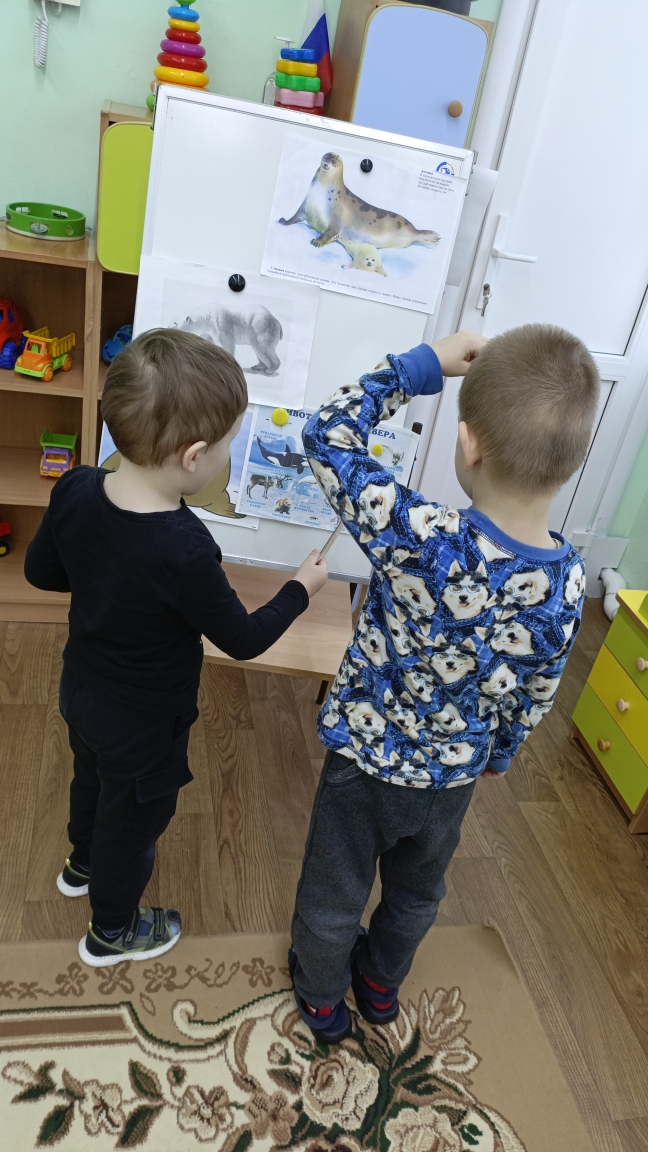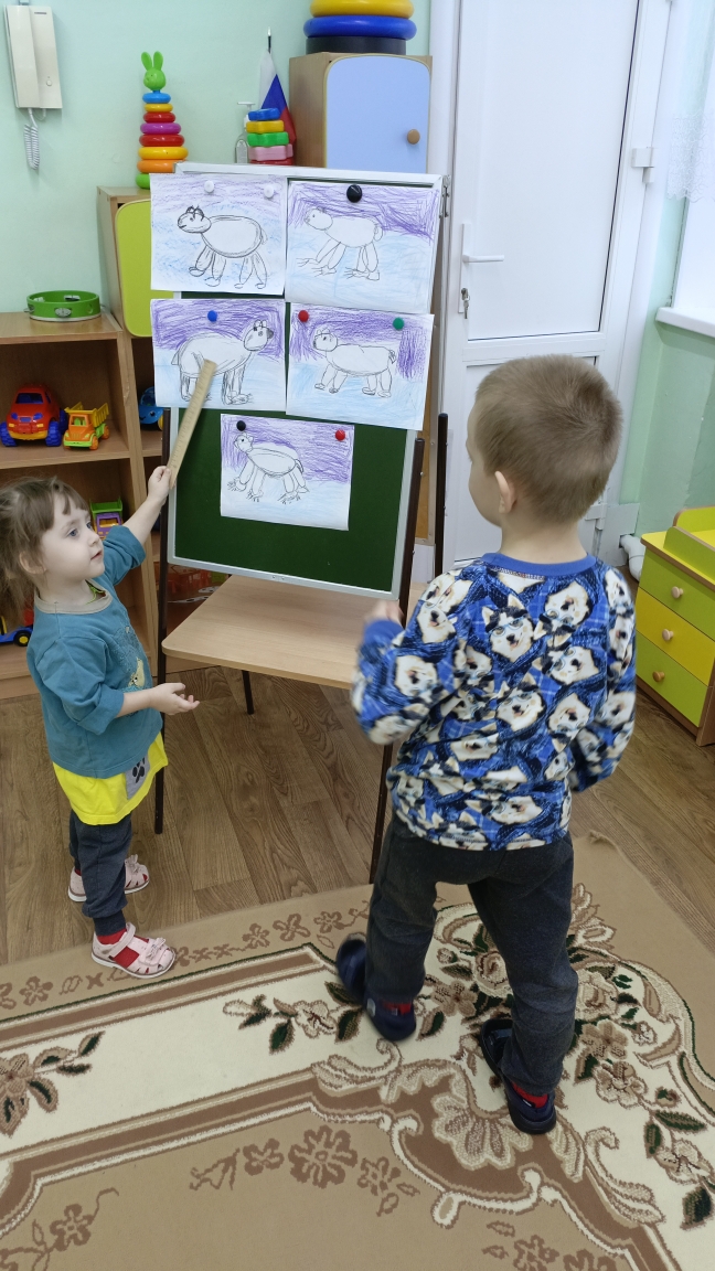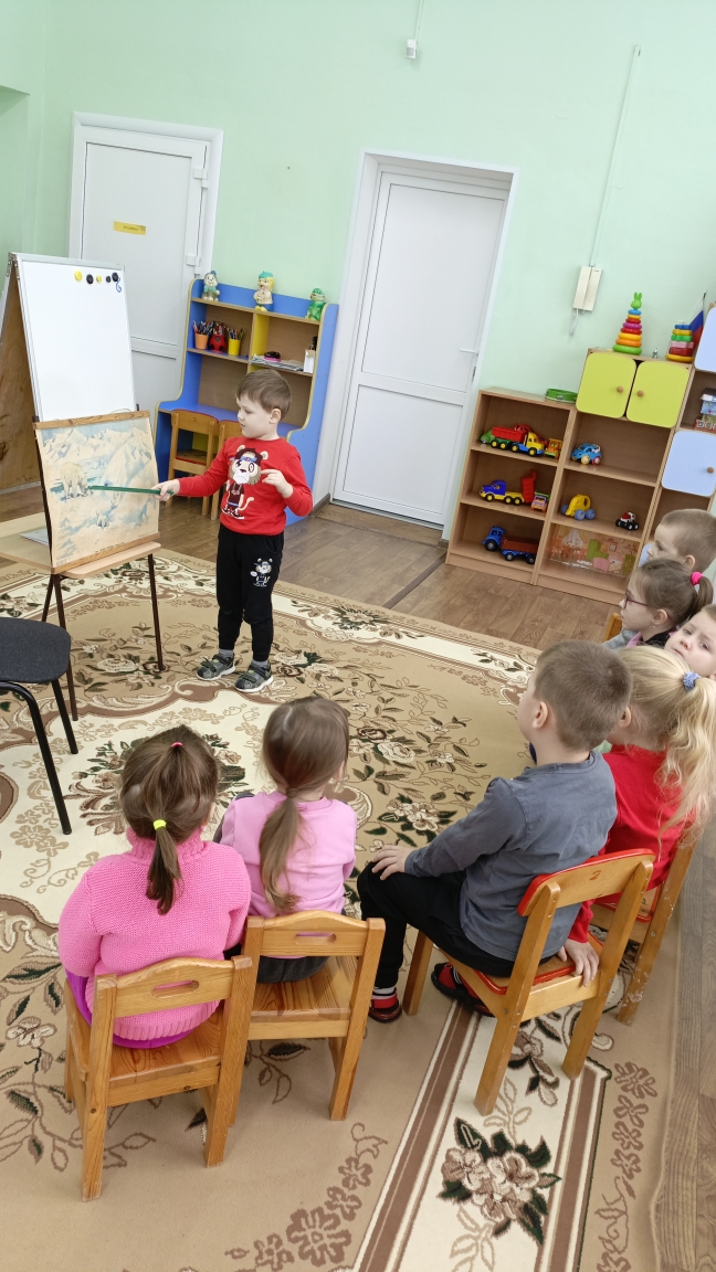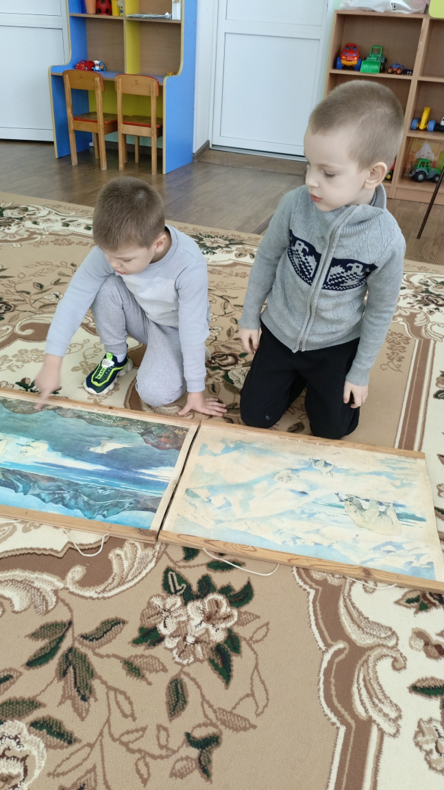 Ребята с неподдельным интересом рассматривали белую медведицу с медвежатами на картинах «Белый медведь ранней весной» и «Белый медведь летом».