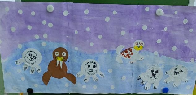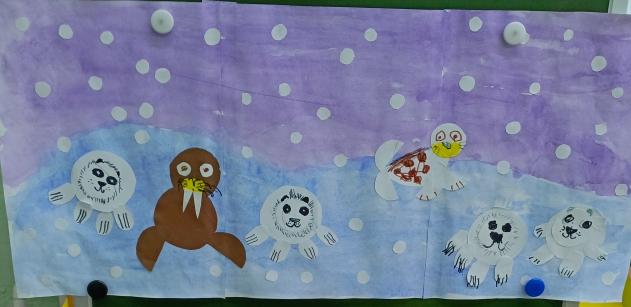 Свои впечатления ребята передали в своих рисунках по теме «Белый медведь» и при выполнении коллективной аппликации «Хозяева севера» из кругов (круги белого цвета целые и разрезанные пополам».