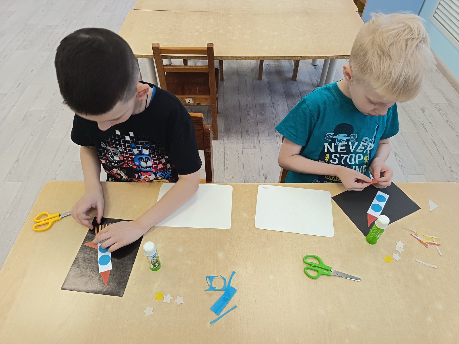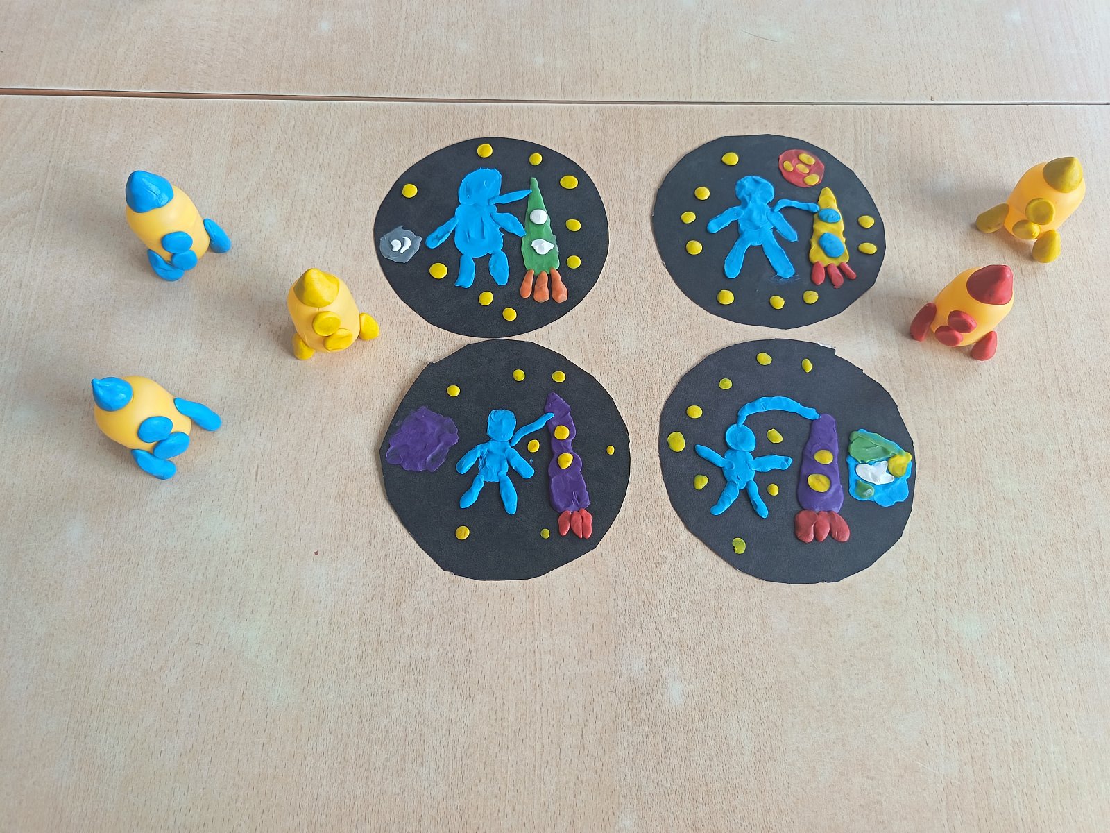 Ребята лепили из пластилина, выполнили аппликацию ракеты и космонавтов в космосе, беседовали о космосе, рассматривали планеты и изучали интересные факты о полётах в космос, играли в настольные и подвижные игры.