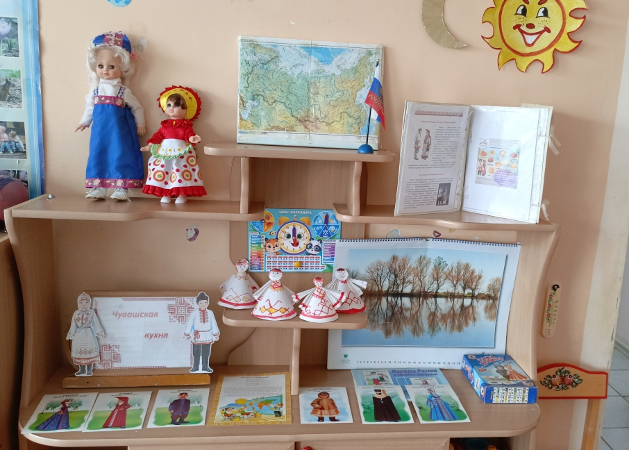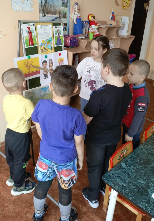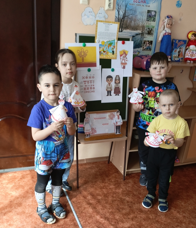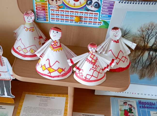 Дети также узнали о народах, живущих в центральной части России, – чувашах и мордве. Чувашский народ славится своим искусством: красивой вышивкой, ткачеством и резьбой по дереву. Старшие ребята даже смогли сами создать чувашскую куклу из бумаги под руководством воспитателя.