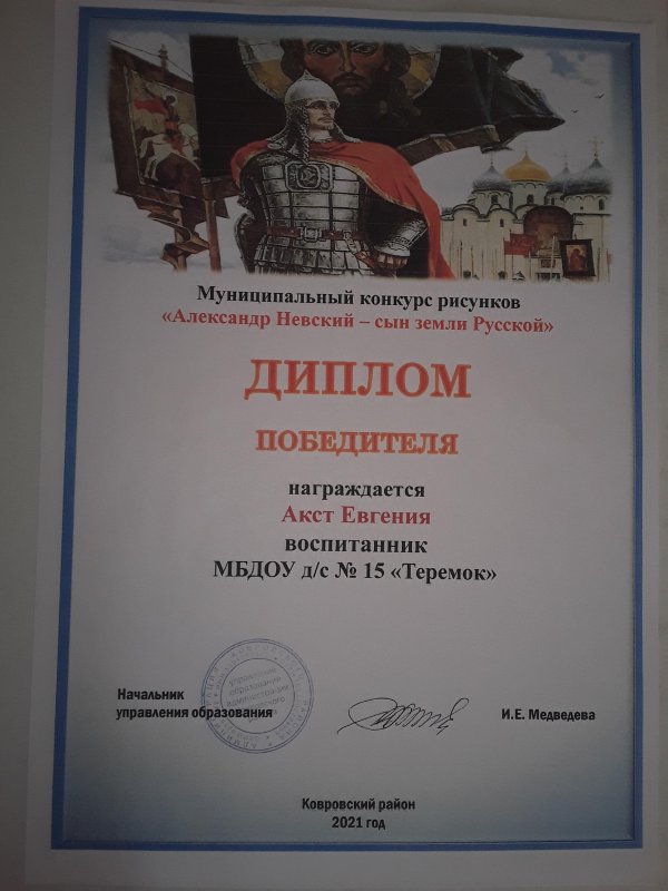 Диплом победителя в муниципальном конкурсе "Александр Невский-сын земли Русской."
