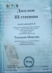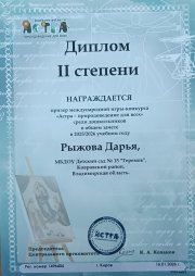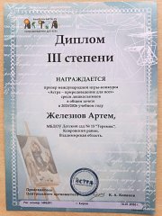 Дипломом 1 степени в первом Всероссийском конкурсе стихов и песен о автомобиле "Азбука автомобиля", направленном на профилактику ДТП с участием детей и приуроченном ко всемирному Дню изобретения автомобиля, награждается Баканова Милана, МБДОУ детский сад