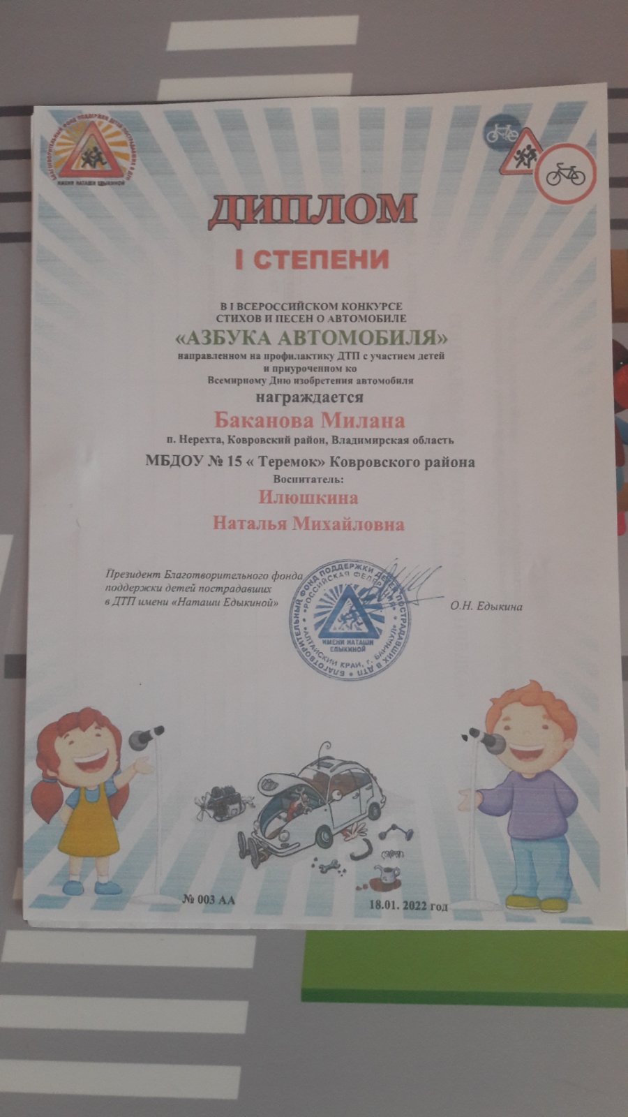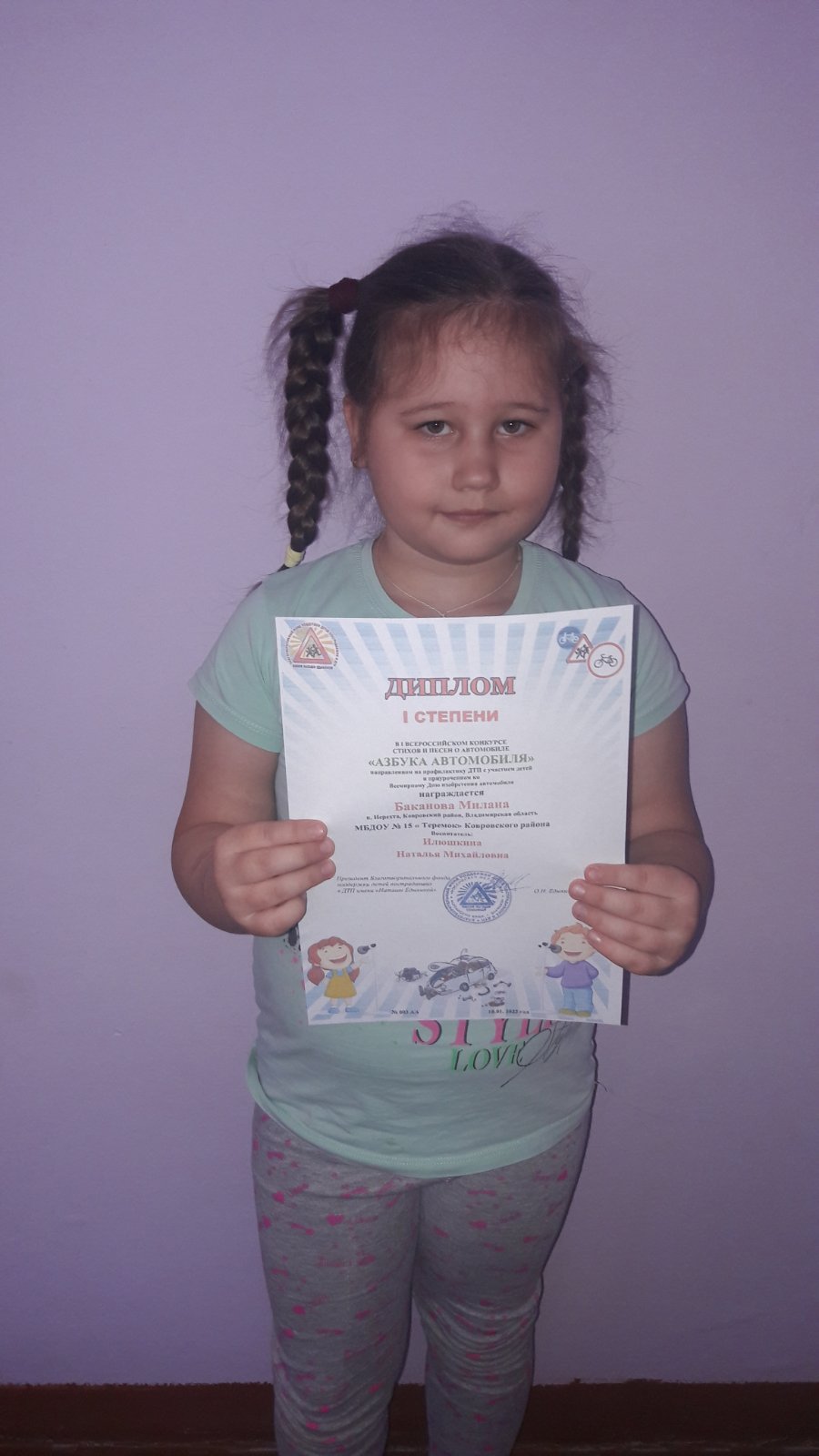 Дипломом 1 степени в первом Всероссийском конкурсе стихов и песен о автомобиле "Азбука автомобиля", направленном на профилактику ДТП с участием детей и приуроченном ко всемирному Дню изобретения автомобиля ,награждается Баканова Милана, МБДОУ детский сад № 15 "Теремок", пос. Нерехта Ковровского района. Воспитатель: Илюшкина Наталья Михайловна.